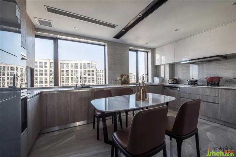 廚餐一體的設(shè)計也讓整個廚房空間大得不同尋常,這樣既能讓用餐區(qū)域與娛樂休閑區(qū)隔離開,又能在平時女主人做烘焙時提供大大的創(chuàng)作平面臺,加之明亮的大窗也增加了整個廚房的采光,讓這個用餐空間變得明媚了起來。