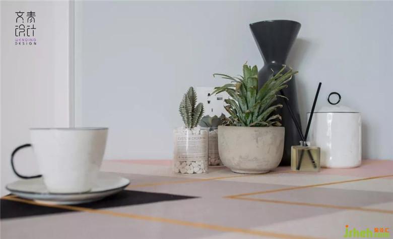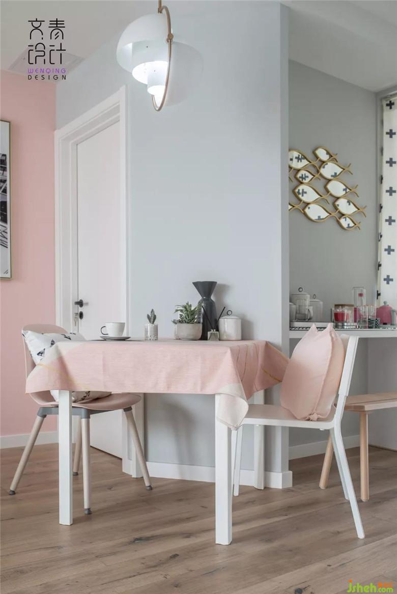 在這個(gè)可愛的小窩里,客餐廳依舊是緊密相連的,為了順應(yīng)戶型的格局,餐廳的設(shè)計(jì)巧妙的采用了側(cè)切式的格局,餐桌緊貼著這塊斜方的墻面,這樣的設(shè)計(jì)既充分的利用了這片小空間,又不失美觀大方,營造出來的溫馨質(zhì)感瞬間圈粉,二人世界,燭光晚餐,突然有點(diǎn)甜。