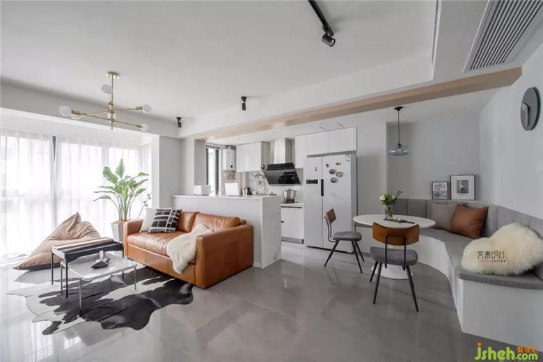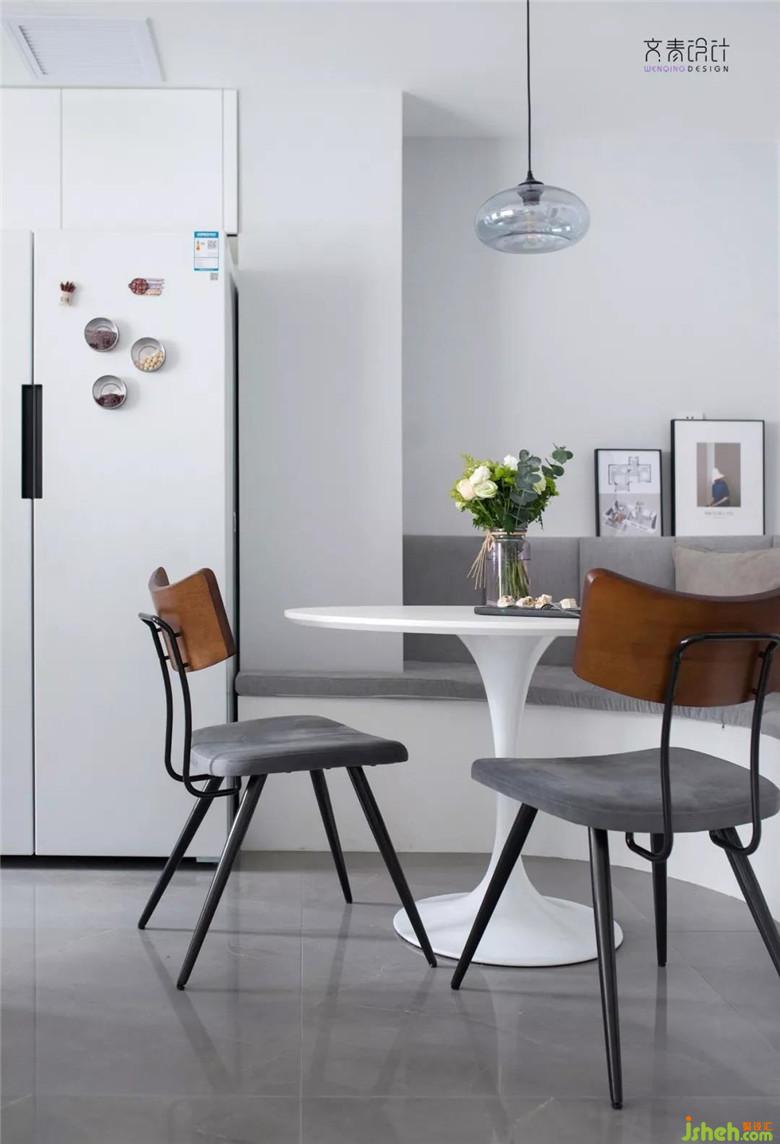 每套小戶型的餐廳貌似都會(huì)有點(diǎn)局促,而這套案例點(diǎn)睛之處就是這處餐廳卡座。圍繞創(chuàng)意圓燈,將人物就餐動(dòng)線展開。使用起來比方正的格局要自由許多。