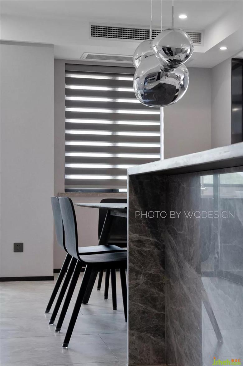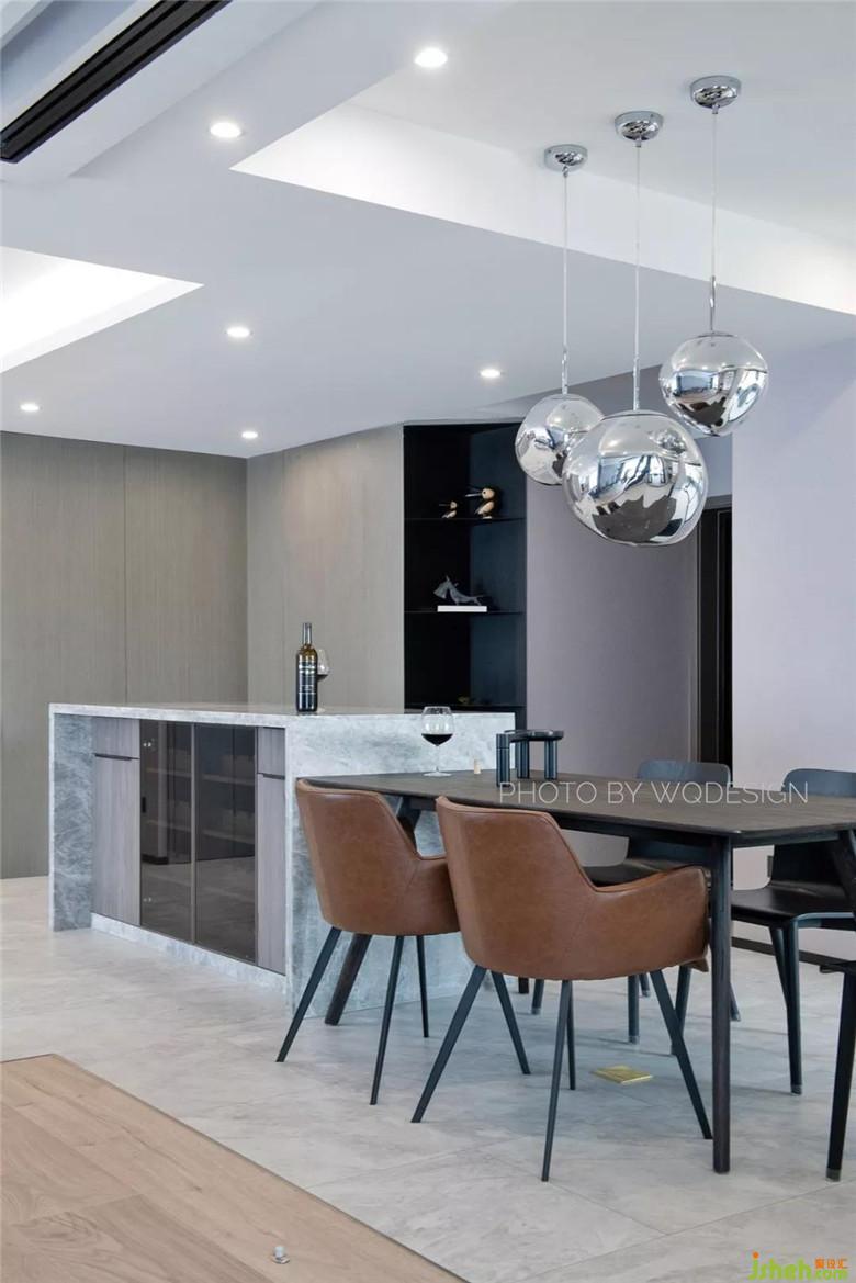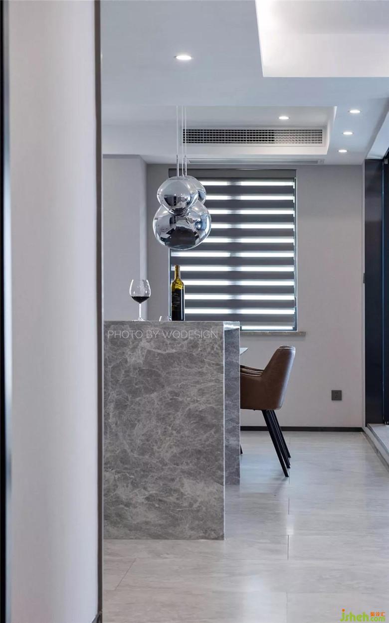按常規(guī)設(shè)計來說,中導一般設(shè)計在廚房附近。這里將中導做在入戶門口其實另有深意。女業(yè)主不喜歡一進家門就一眼望盡空曠的客廳,這樣令她沒有安全感。也不喜做一個能阻擋全部視野的入戶門廳。而且這個中導里是一個容量較大的酒柜,使用起來十分方便。