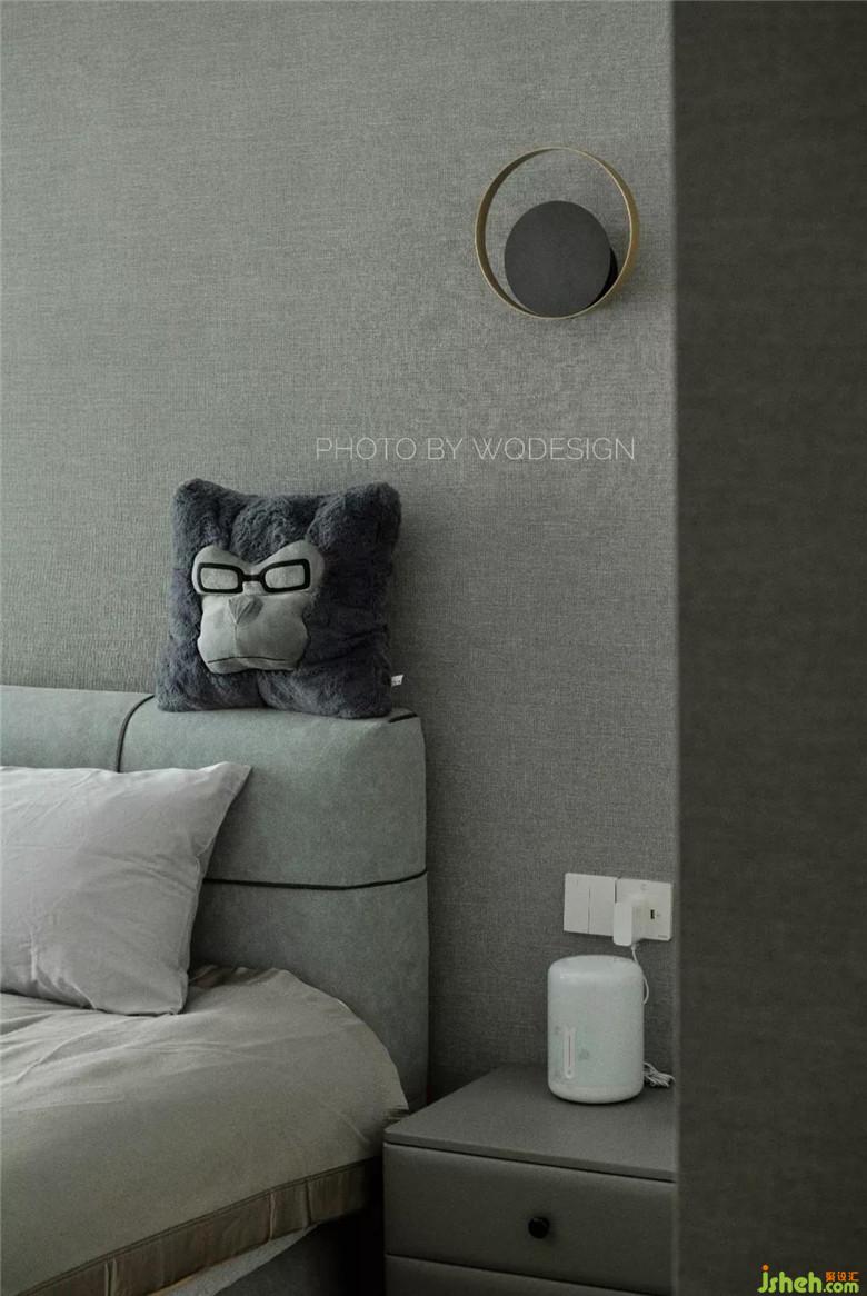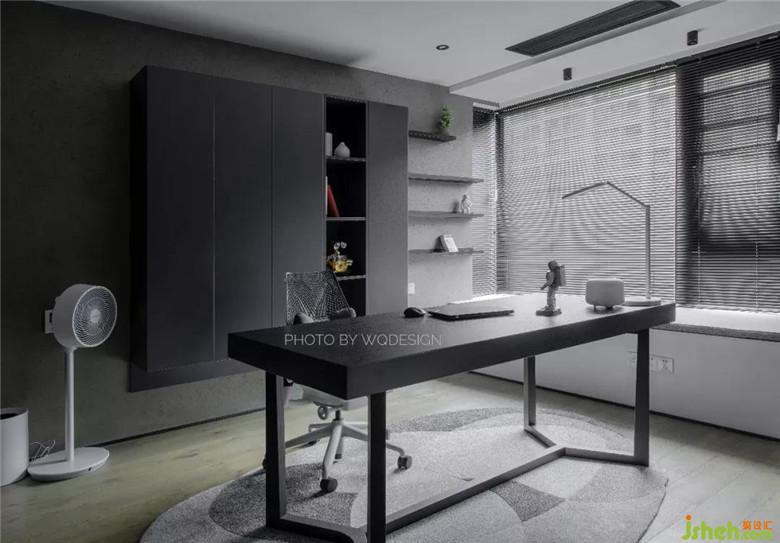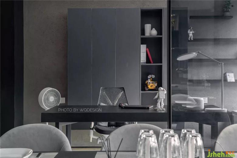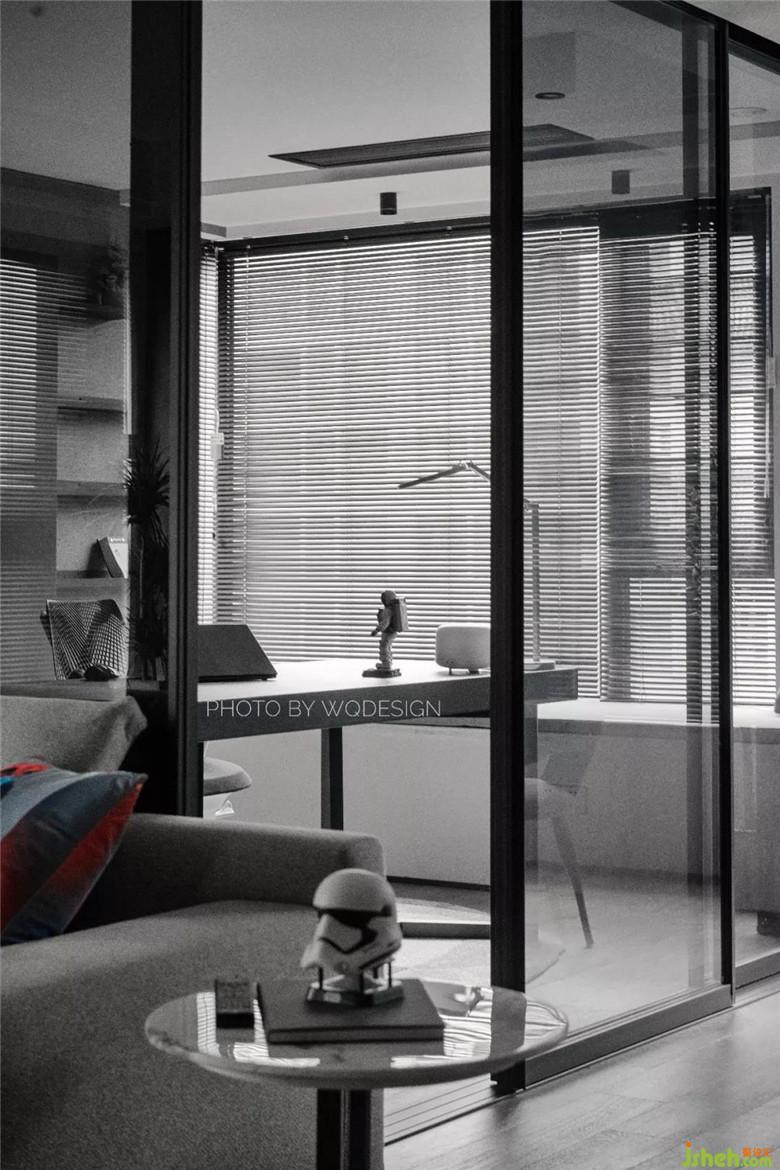 呂先生在和設(shè)計(jì)師對方案之初,就有把書房留作兒童房之用,因此電源留口都是臥室的配置。但近幾年這里做臥室的話,稍顯浪費(fèi)。因此,將兩面墻體都推倒,用黑玻作隔斷,保證一定的隱私性,空間質(zhì)感也很棒。半開放書柜,開放部分留出作擺件展示,另一部分用作藏書,十分實(shí)用。