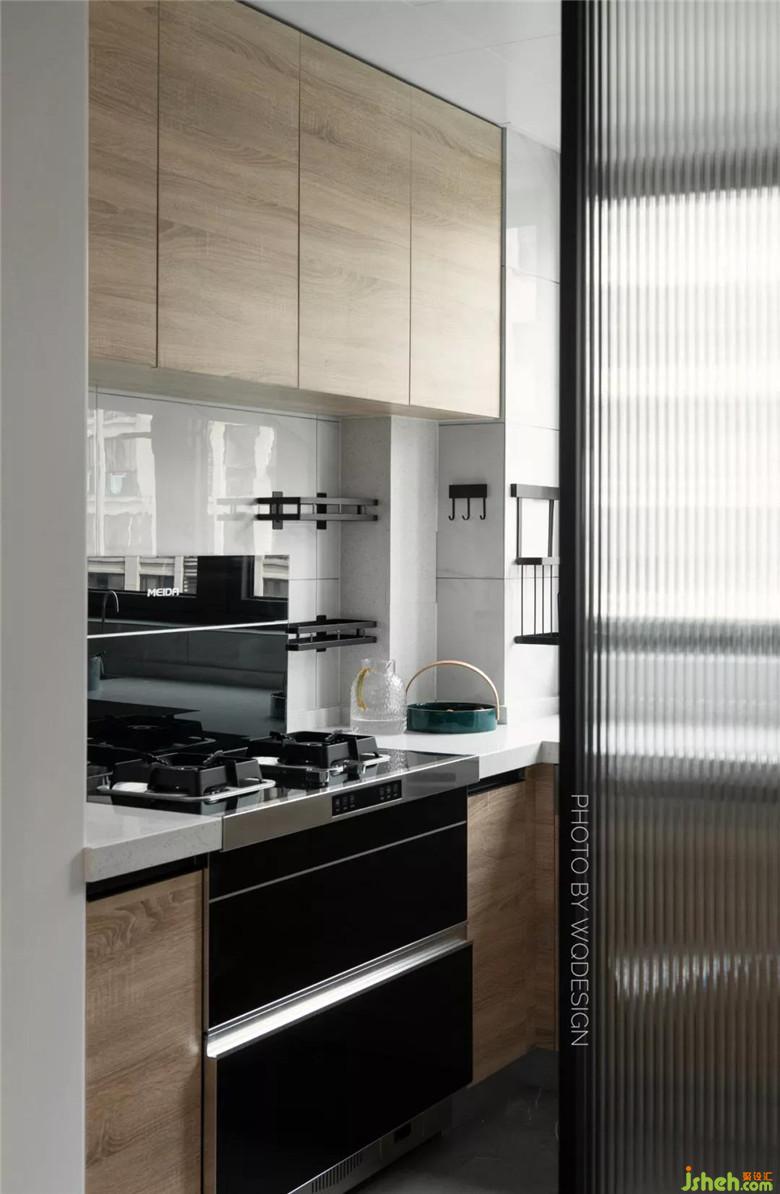 餐廳一側(cè)用實(shí)墻隔出兩個開放小隔間,一邊兒做水吧臺,分擔(dān)廚房的部分功能,一邊兒擺上餐邊柜,作收納置物的功能,造型也比較好看。