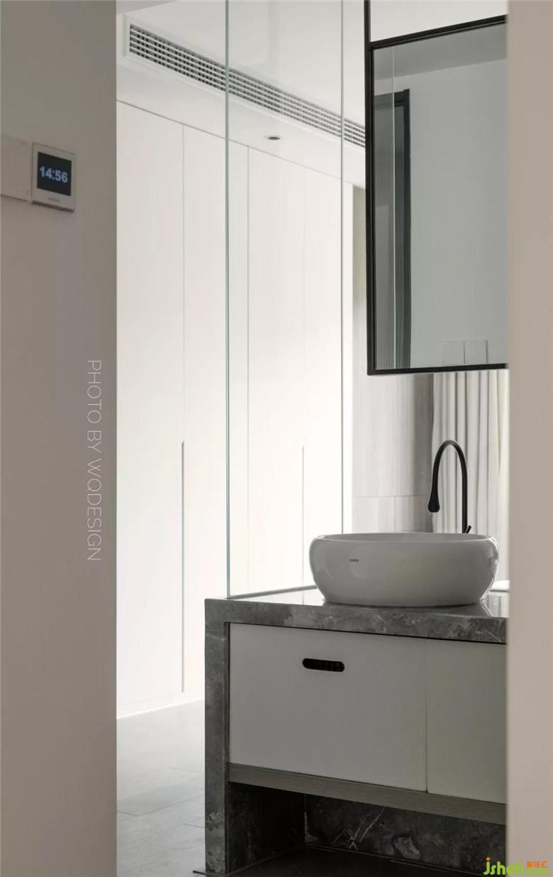 轉(zhuǎn)角用高到天花板的玻璃作隔斷,保證轉(zhuǎn)角光線的通透性。主臥應(yīng)業(yè)主需求沒做電視背景墻,而用一整面柜子來代替,視覺效果和實(shí)用性都很贊。