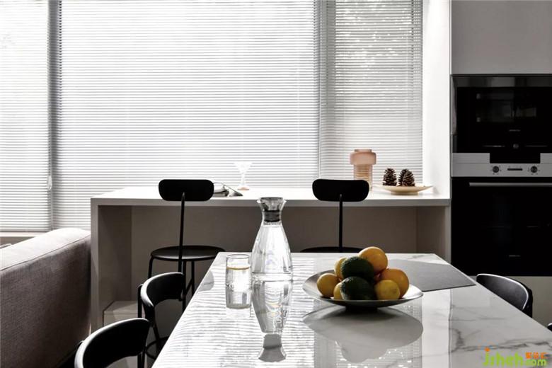 位于餐廳邊的定制書桌,很好地詮釋了功能性。朝南,用百葉簾來控制進光,適合晨起閱讀。下廚、準備就餐時,也能當做導臺使用。