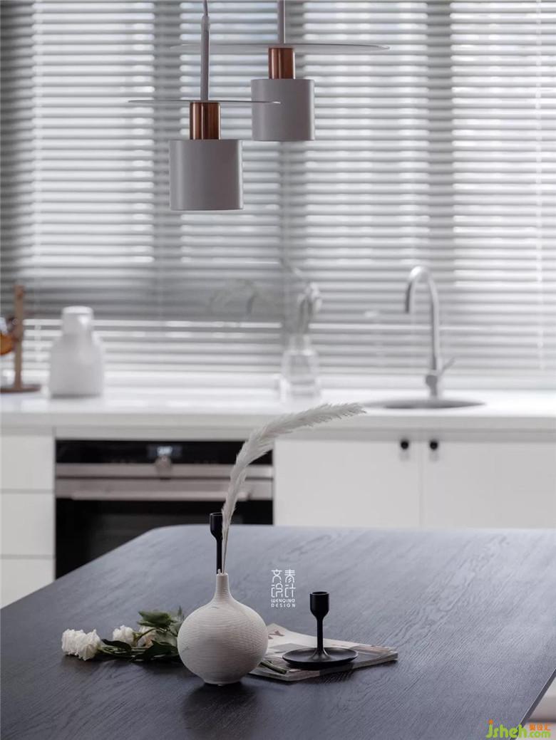 餐廳處的木飾面由墻面延伸至吊頂,其色彩和紋理線條顯得比較簡潔明快。鑲嵌在木飾面板里的筒燈,搭上開闊的空間,是開闊的展廳感。