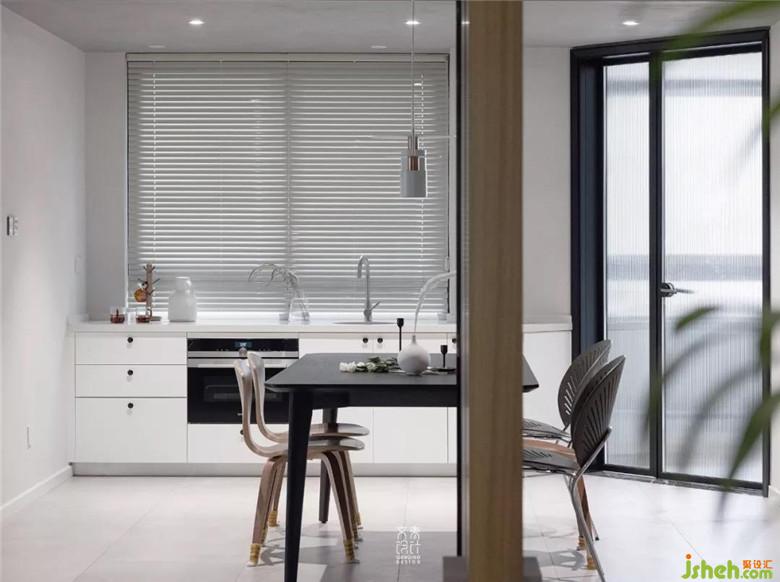 原四四方方的書房改成廚房,進門處的墻砌成斜面,優(yōu)化行走動線,打開房門也更方便餐廳與廚房的交互。