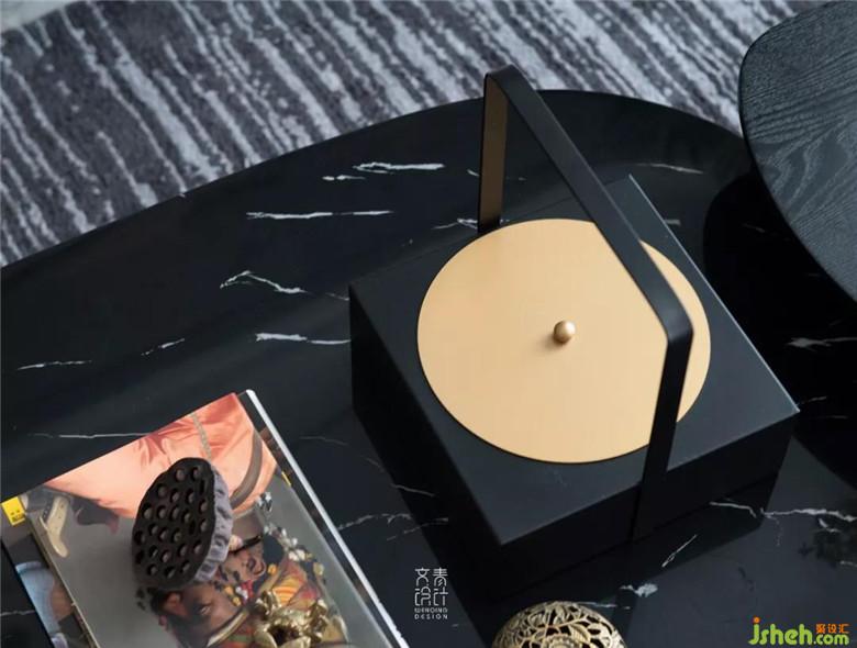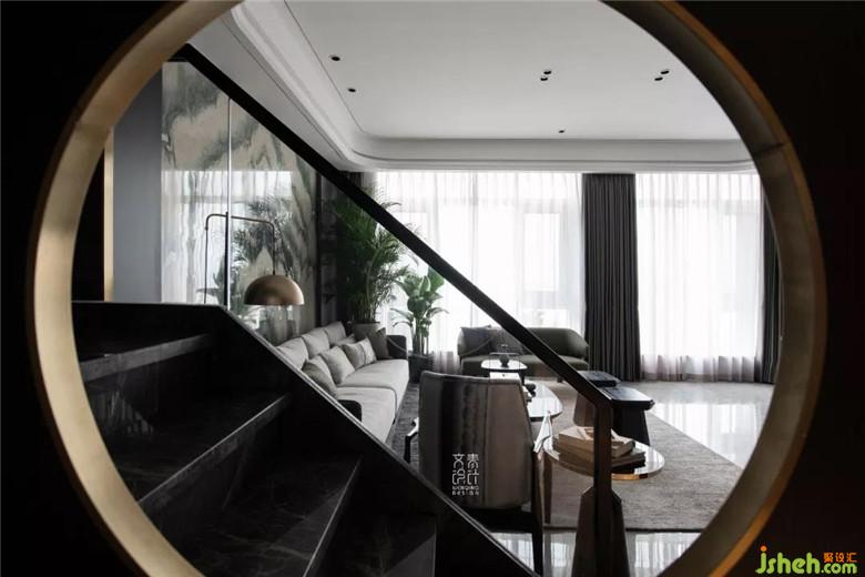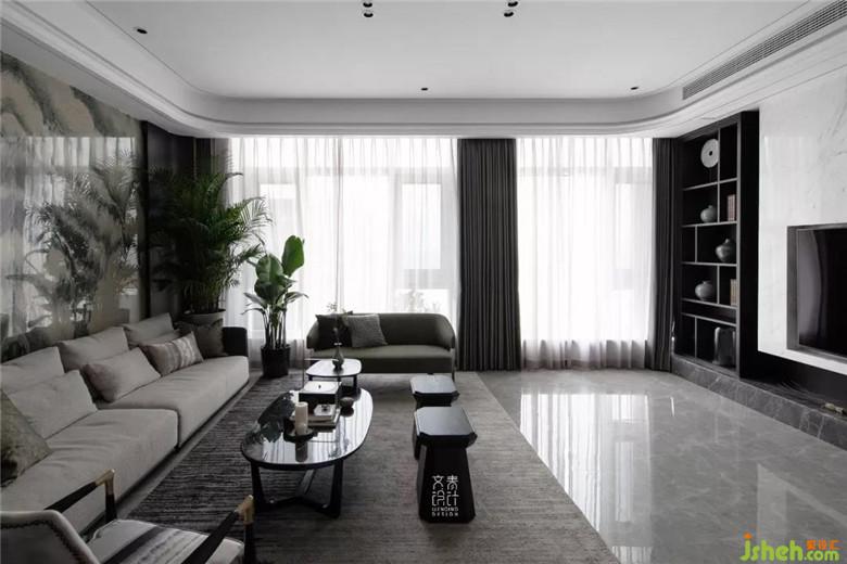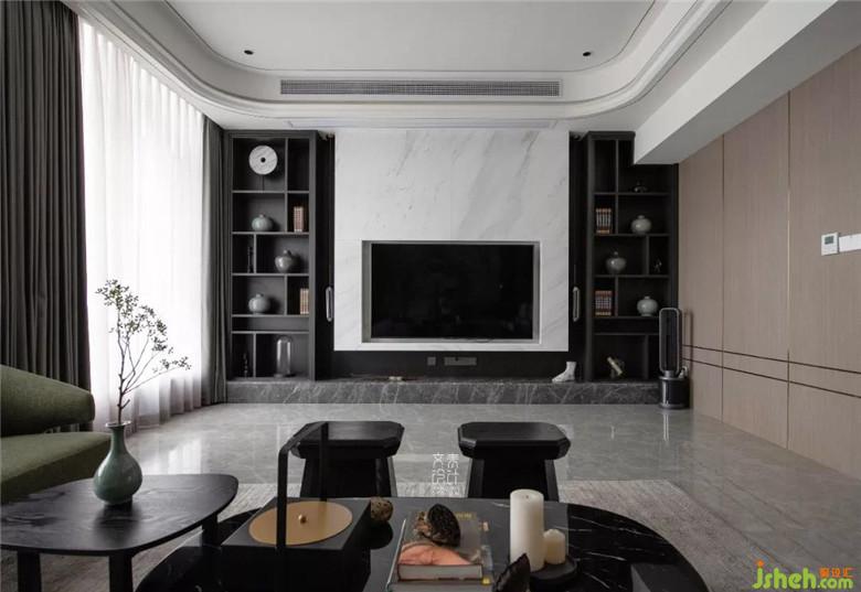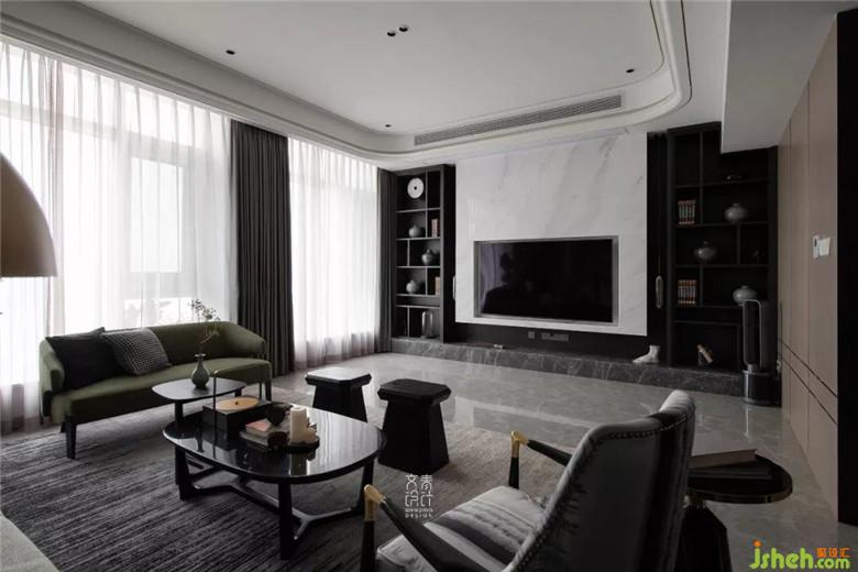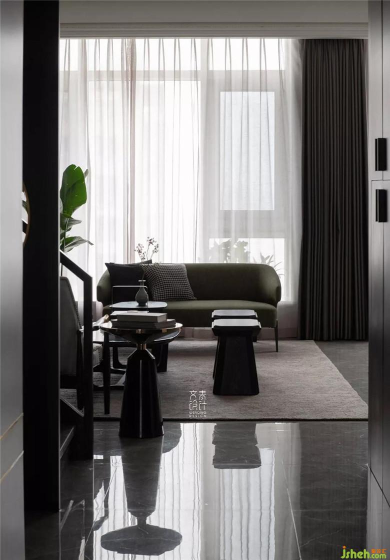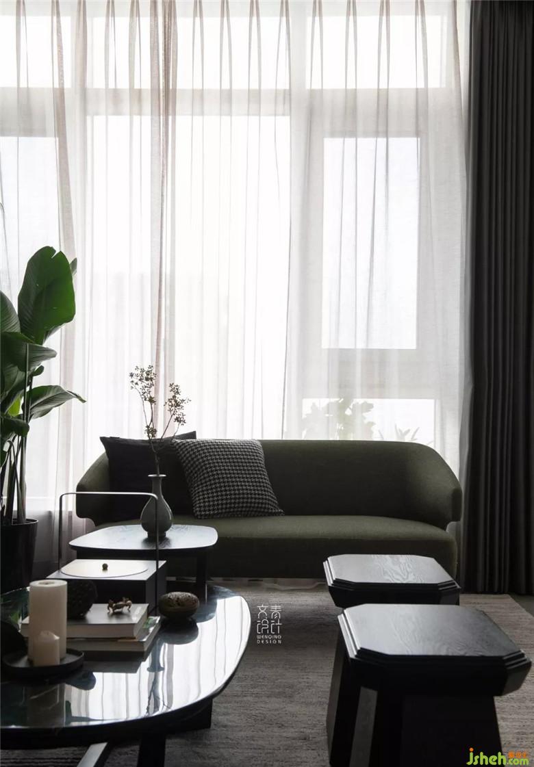 公共區(qū)域客廳其實沒有加入太多中式元素,對向排布的沙發(fā)、單椅;圓潤的茶幾;翠紋背景墻;幾樣小擺件;僅此而已。但神奇的是也僅僅這些元素就可以將偏現(xiàn)代的空間營造出禪意。
