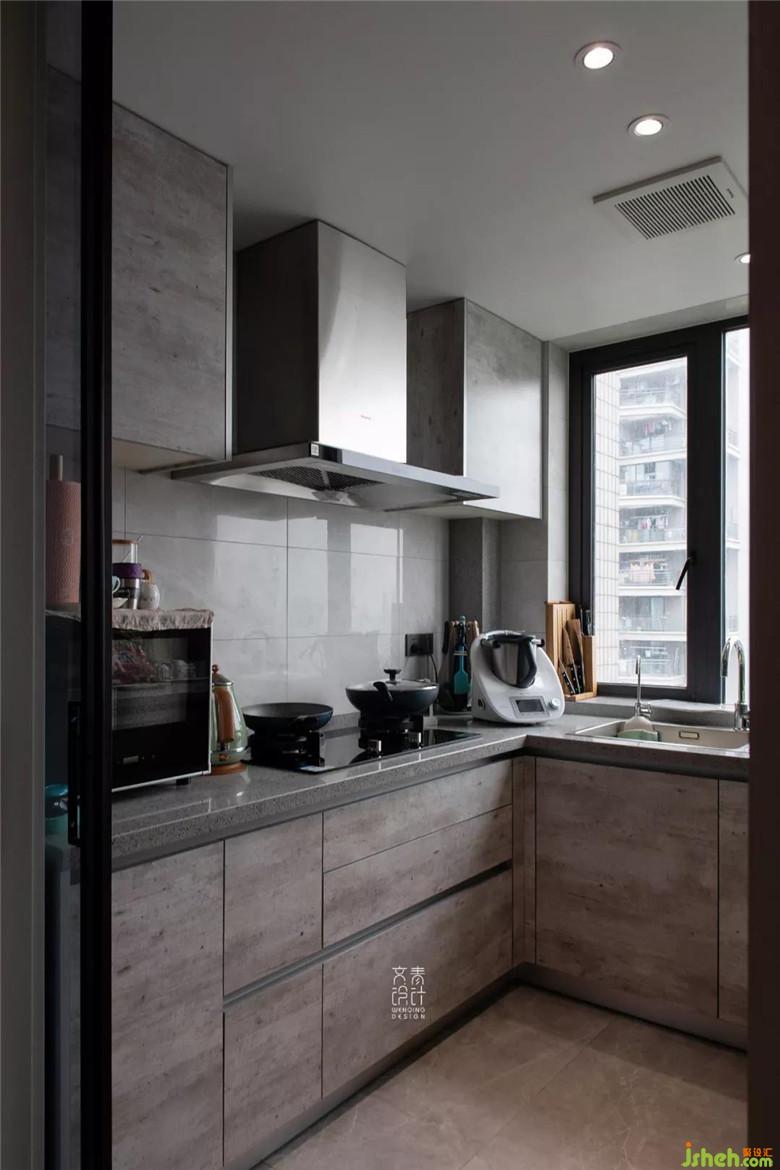 水吧臺(tái)分擔(dān)出廚房的一大部分功能,裝修公司規(guī)劃好的櫥柜也正好用來(lái)擺放業(yè)主旅游套來(lái)的飲品。