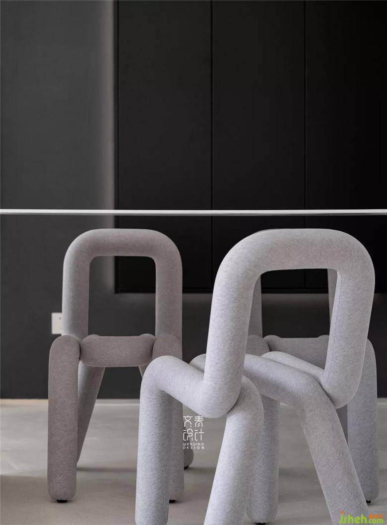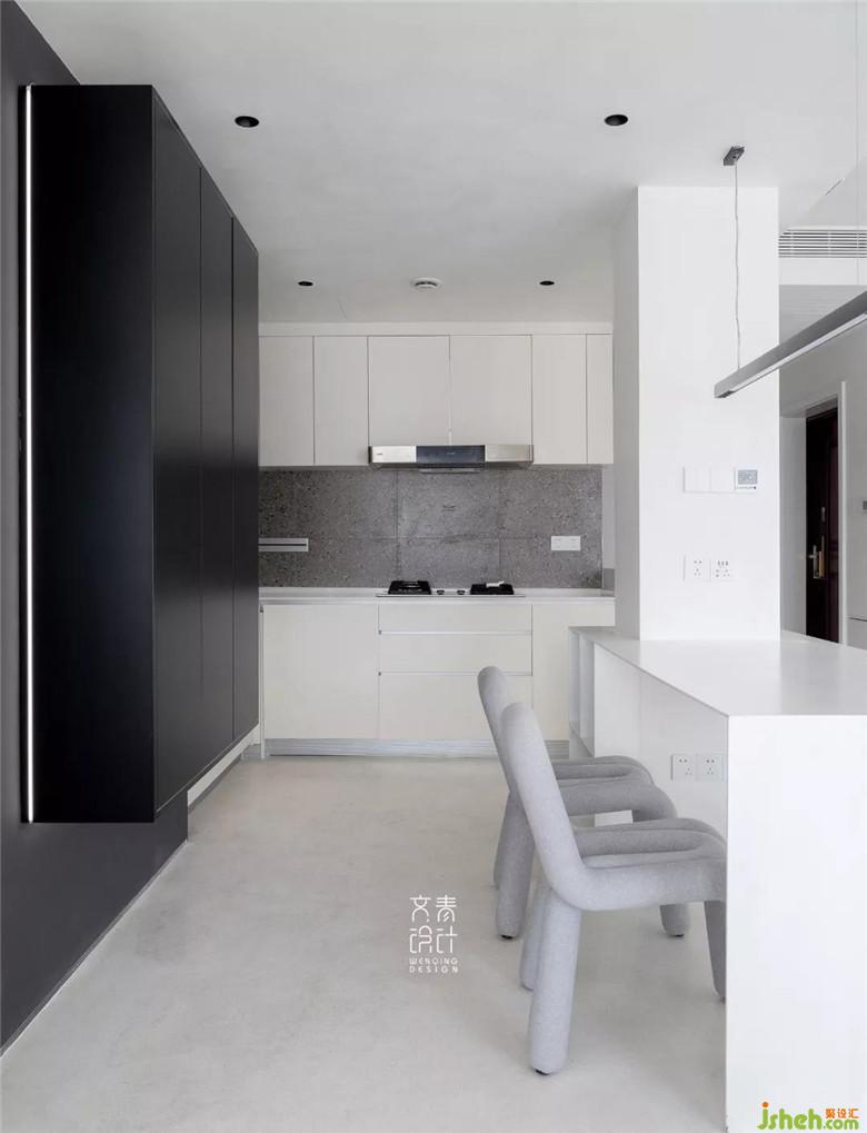 裝修公司用僅不到10毫米厚的鑄剛純白餐桌,融于這一整個純白空間的,絲毫不顯得突兀。設計中減法做到極限的這里,在這兒就餐你也僅僅只會把注意力放在食物上。