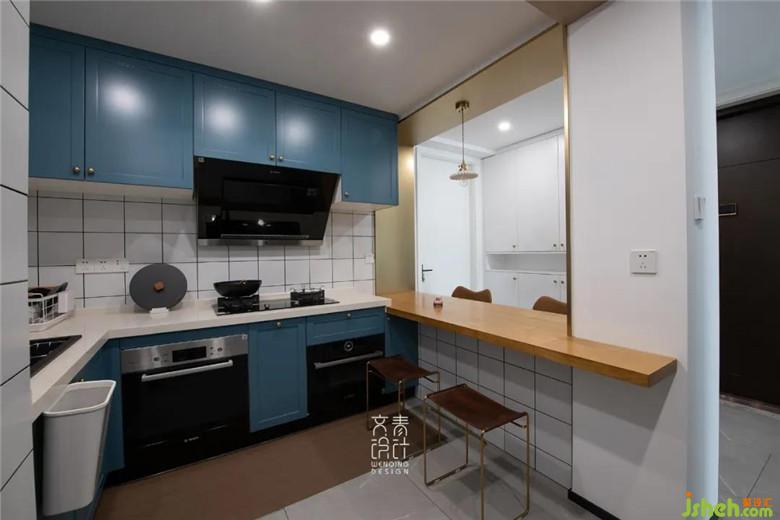 廚房色彩同樣是呼應(yīng)客廳的湖藍(lán)色,同時(shí)融入一些金屬元素造型,規(guī)避了硬裝改造后的暴露出的錯(cuò)亂的橫梁、管道。