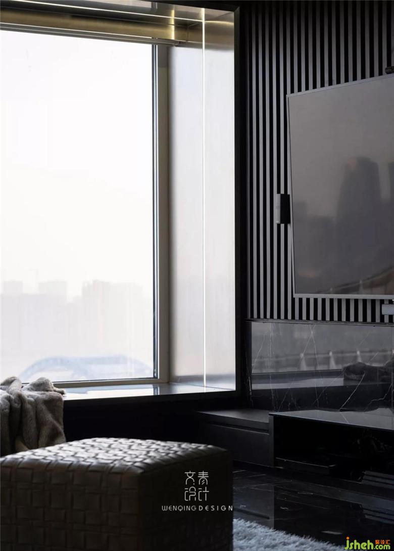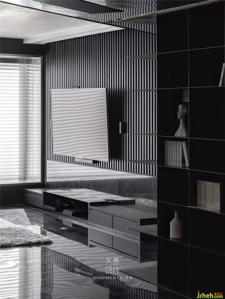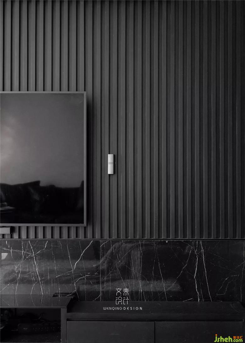 電視背景墻,黑色木頭材質(zhì)的欄珊,結(jié)合黑色大理石拼湊出層次感