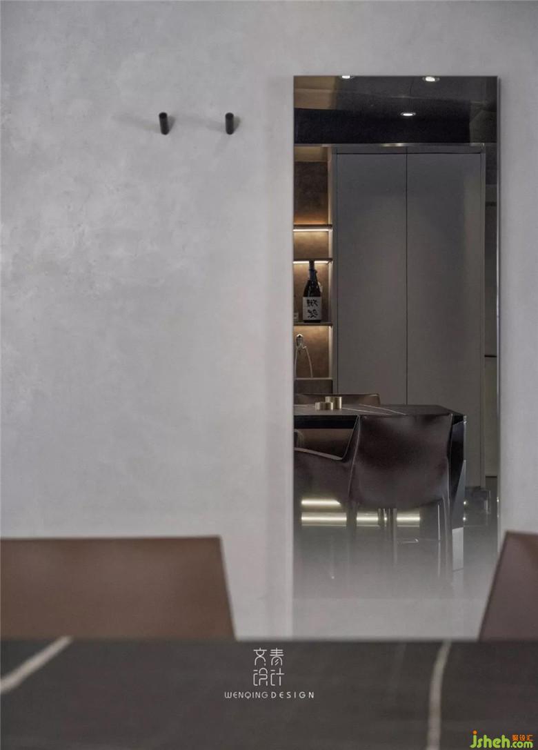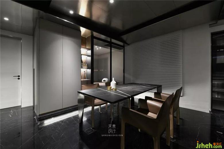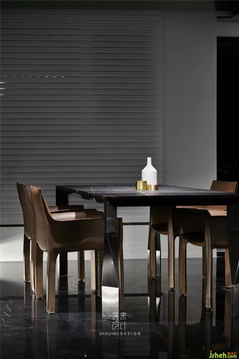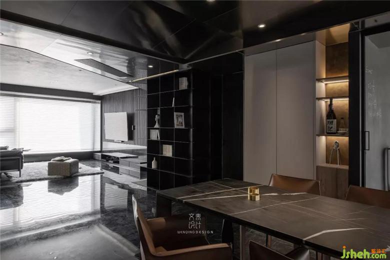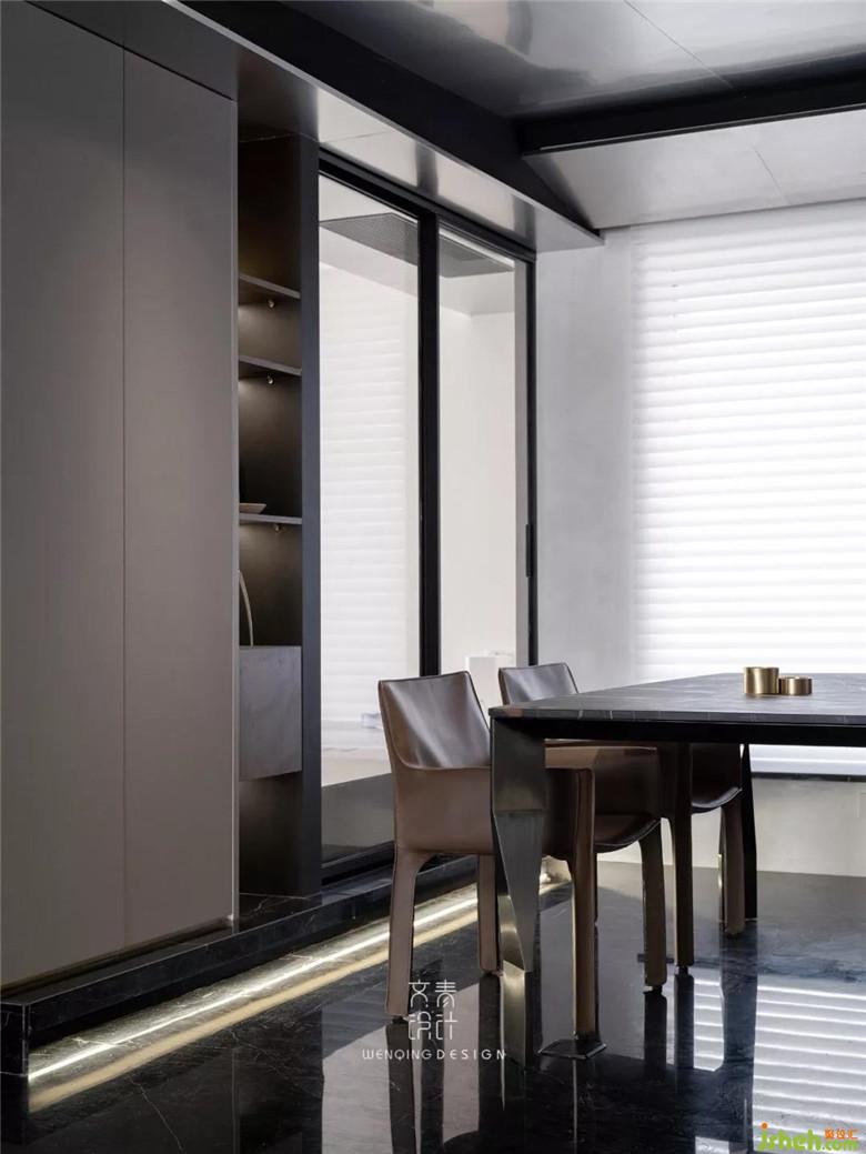 進(jìn)門后看到的第一個(gè)區(qū)域是餐廳,咖色餐椅、不銹鋼和黑色大理石材質(zhì)的餐桌,裝修公司讓空間黑色和金屬元素進(jìn)行到底。餐廳吊頂也是不銹鋼材質(zhì)吊頂,鋼本色。