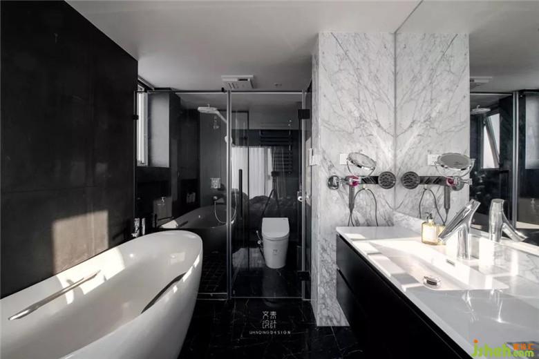 面積足夠的衛(wèi)生間,一個舒適的大浴缸是少不了的,黑白搭配的色系,大理石和瓷磚特別融洽。
