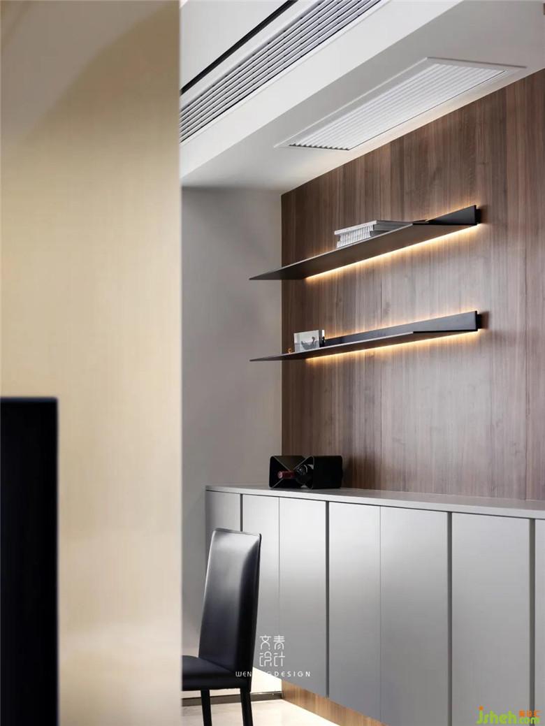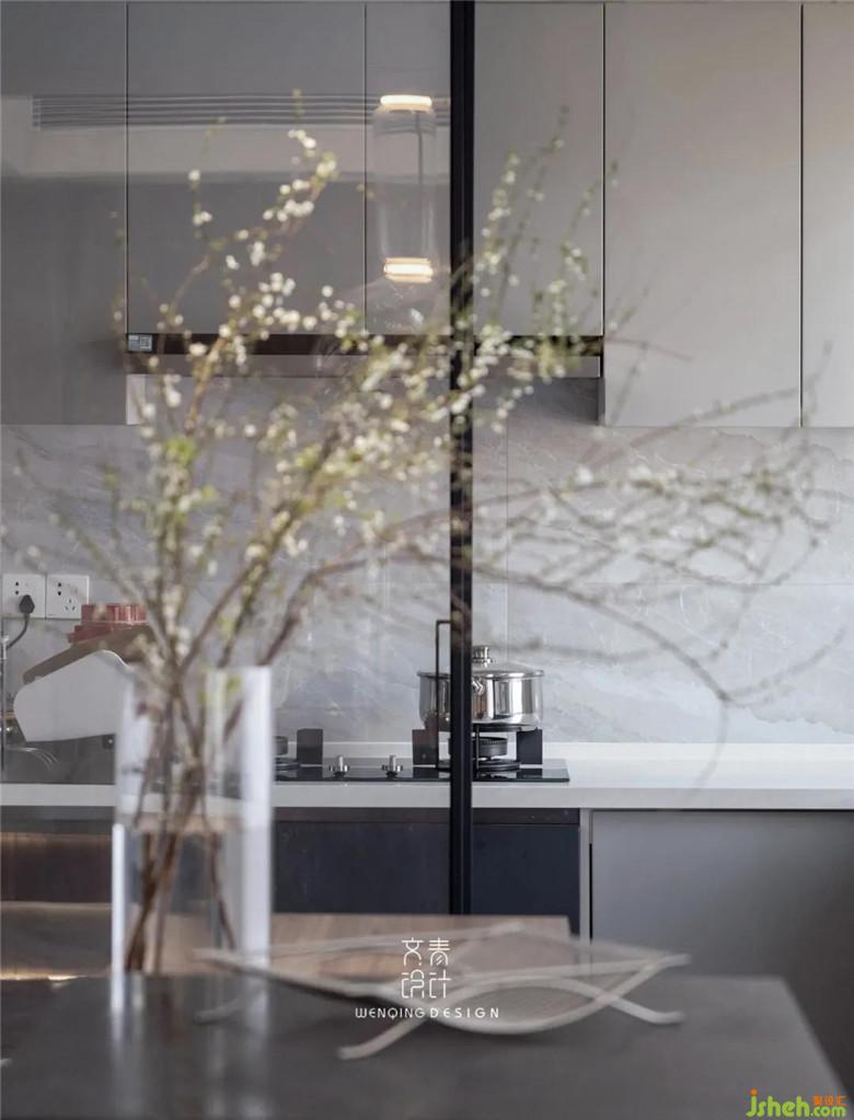 餐廳與客廳之間只用了電視背景墻來簡單隔斷,廚房裝修公司也采用了窄框玻璃門,將線條與簡約貫穿了整個一樓空間,吧臺的設(shè)計使得一個人在家用餐時也不會覺得那么空曠,反而多么一絲隨性。