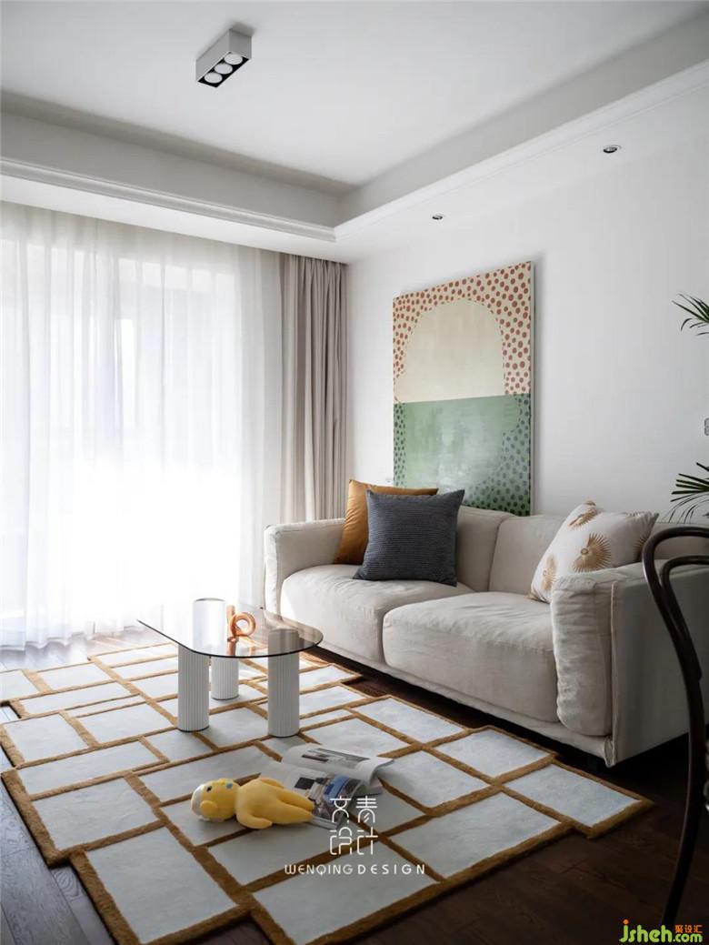 客廳原本就是簡單的大白墻,裝修公司將客廳整體墻面做了暖白色的乳膠漆,讓空間更加明亮溫暖。地毯也擺脫了中規(guī)中矩的造型,幾何圖案的拼接,也讓地毯更具延伸感。