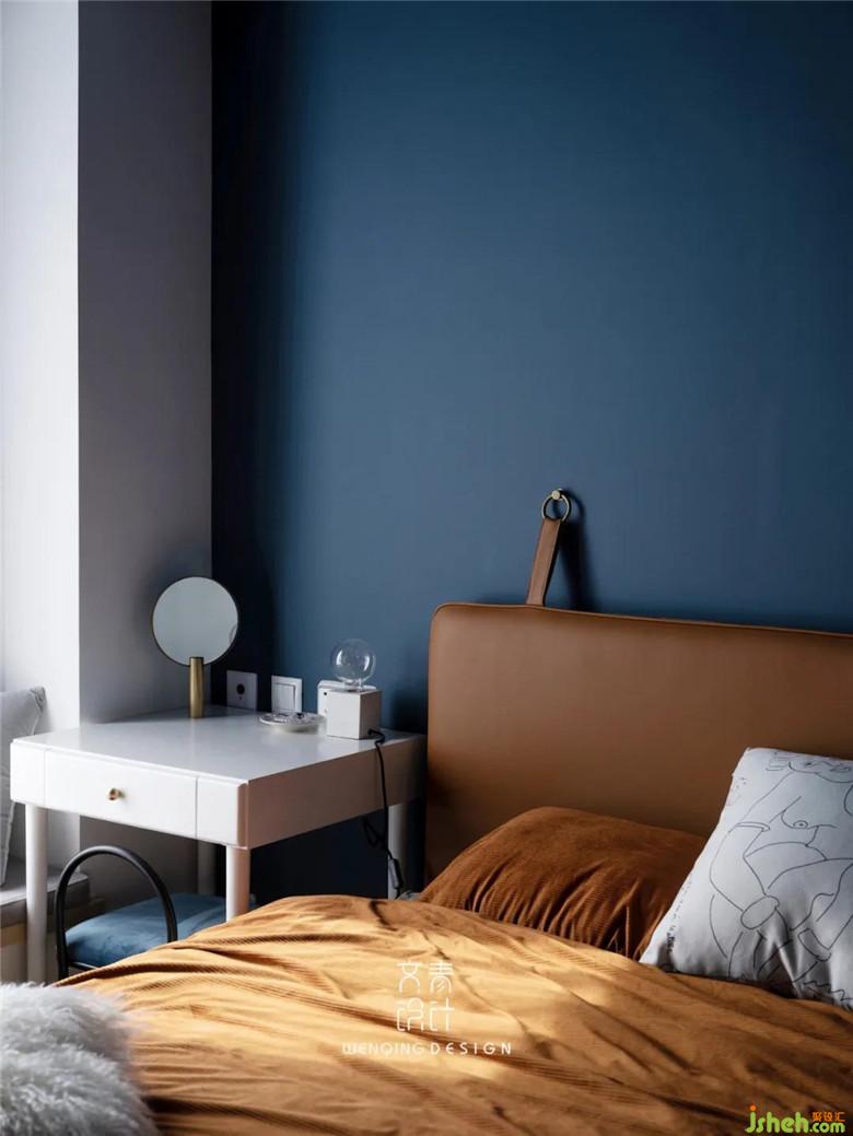 臥室精裝修的吊頂沒做修改,三面墻都刷了湖藍(lán)色乳膠漆,顏色跟上吊頂,裝修公司弱化了原始吊頂?shù)膹?fù)雜石膏線走邊,靠窗的墻選擇留白,陽光透過窗戶散落,既能達(dá)到業(yè)主想要的靜謐感,整體空間也不會壓抑。