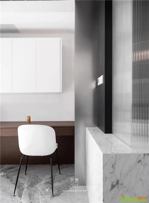書房旁的公衛(wèi)采用不銹鋼吊頂,獨(dú)樹一幟的設(shè)計(jì),往往能讓人眼前一亮,不銹鋼材質(zhì)從頂延伸至墻面,與木飾面、玻璃和大理石形成材質(zhì)反差,讓視覺直觀體驗(yàn)到設(shè)計(jì)的碰撞感。