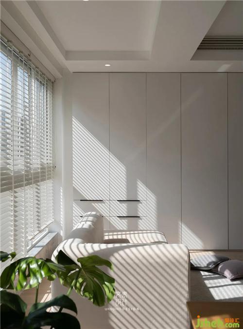 進門右轉即是全開放式的起居空間,借助戶型優(yōu)勢,客廳有著一整排大大的落地窗,在家中直接面對窗外的混凝土叢林過于冰冷,杭州裝修設計用百葉簾將窗景進行分割,能進入家中的,都是經過篩選的好風景。