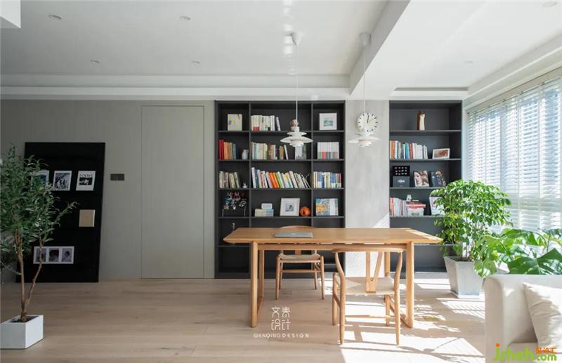 客廳另一側(cè)則改造成家中的開(kāi)放式書(shū)房,我們將墻體往主臥內(nèi)推,定制內(nèi)嵌式開(kāi)放書(shū)柜,原本突兀的承重柱,剛好切斷滿墻書(shū)柜的壓抑感,創(chuàng)造了視覺(jué)上的呼吸點(diǎn)。