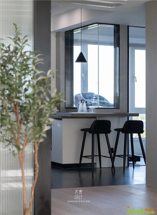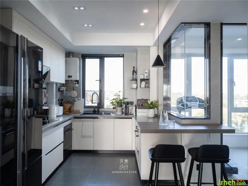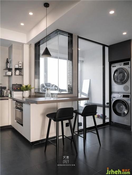 健身房與廚房?jī)H一玻之隔,借助玻璃的通透性增加廚房采光性,在吧臺(tái)用餐時(shí)也能欣賞窗外的風(fēng)景,視覺(jué)味覺(jué)雙滿足。
