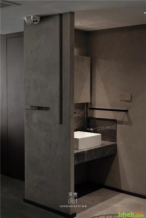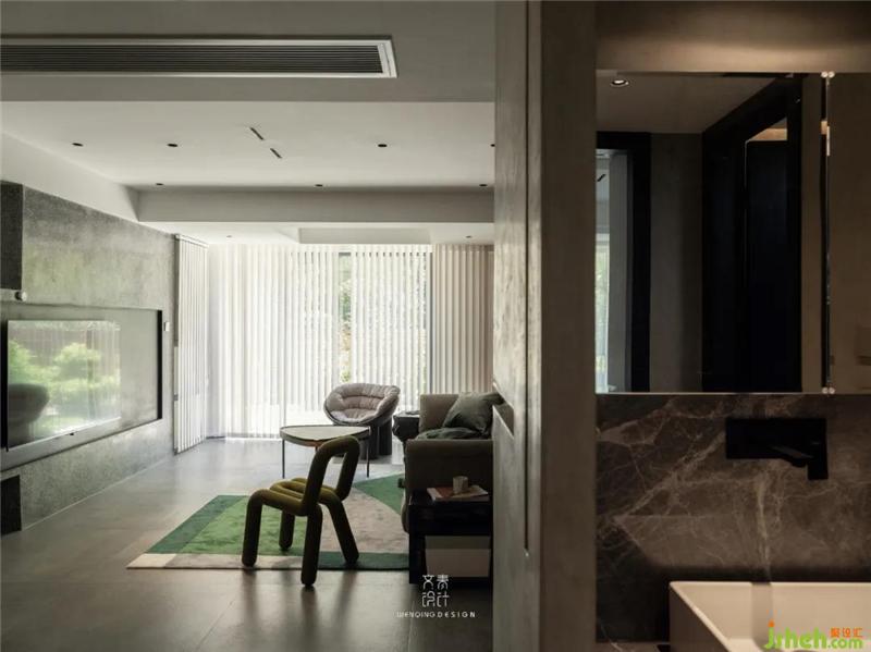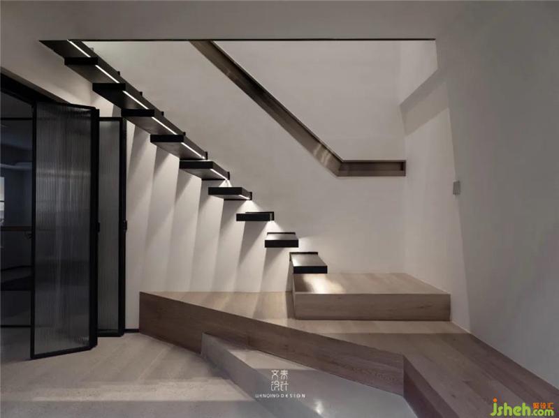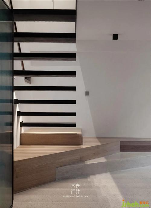懸浮式樓梯底部暗藏燈帶,光影交錯之間賦予了空間動態(tài)的美感,地下室用水泥臺階銜接過渡,材質(zhì)之間的交融,順勢將人帶入水磨石地下室空間。