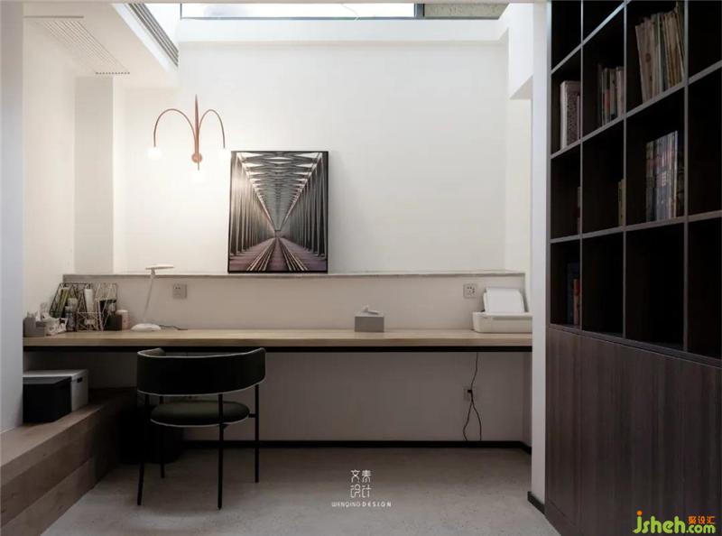 地下室工作區(qū)剛好布置在透光天窗下方,順著臺階延伸的地臺,也能供人工作之余小憩一下。