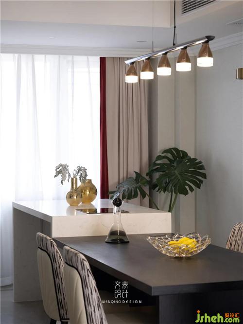 餐廳定制島臺(tái)外加一米八的大餐桌,輕松容納家中五口人同時(shí)用餐,島臺(tái)下面就是酒柜,充分提高空間使用率。島臺(tái)上的兩個(gè)小金瓶是瑞典的Skultuna Boule,餐桌的醒酒器是英國(guó)的Tom Dixon Tank,生活離不開精致的儀式感。