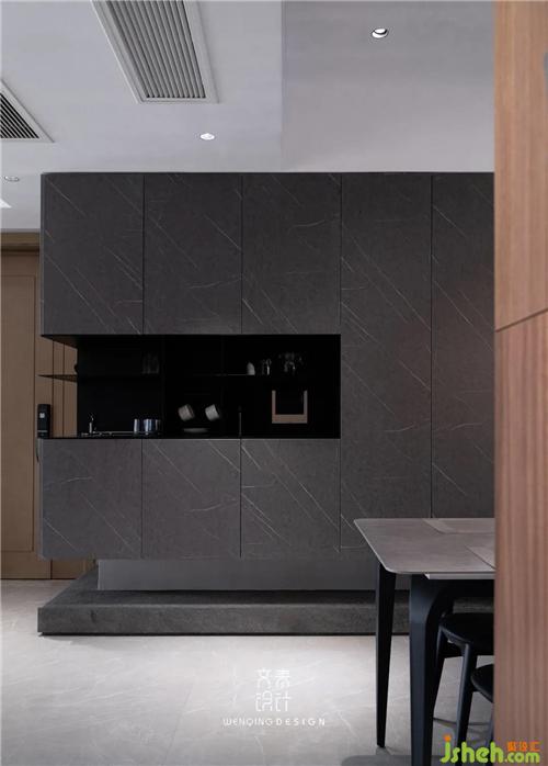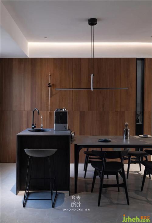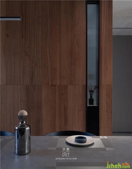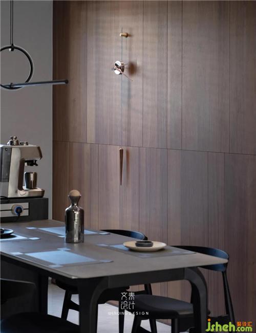 溫潤的木飾面浸潤整個空間,深灰的餐桌如同林中磐石,所有造型,材質(zhì),光線都在設計的交融下回歸自然,一種壓倒性的溫暖質(zhì)感,在空間中慢慢暈開。