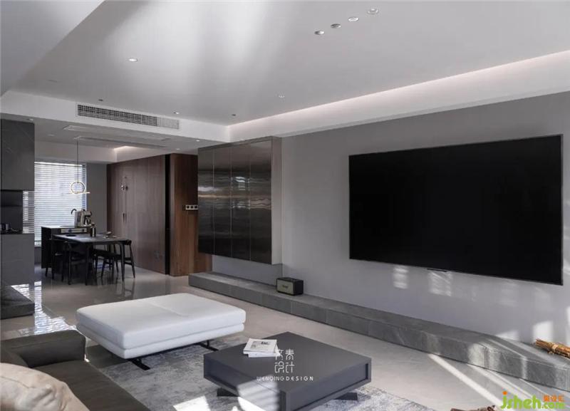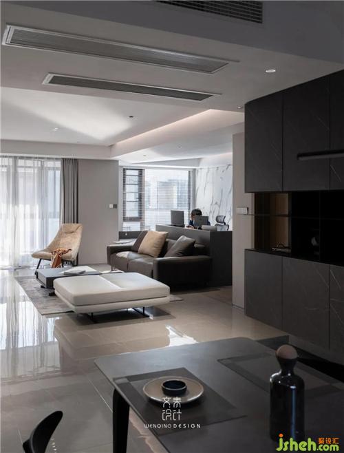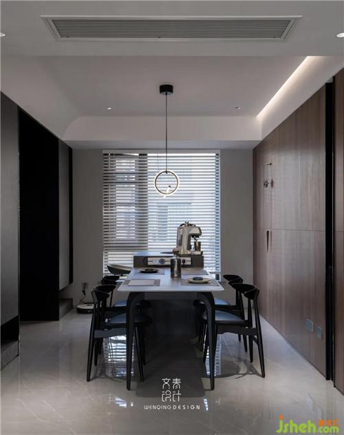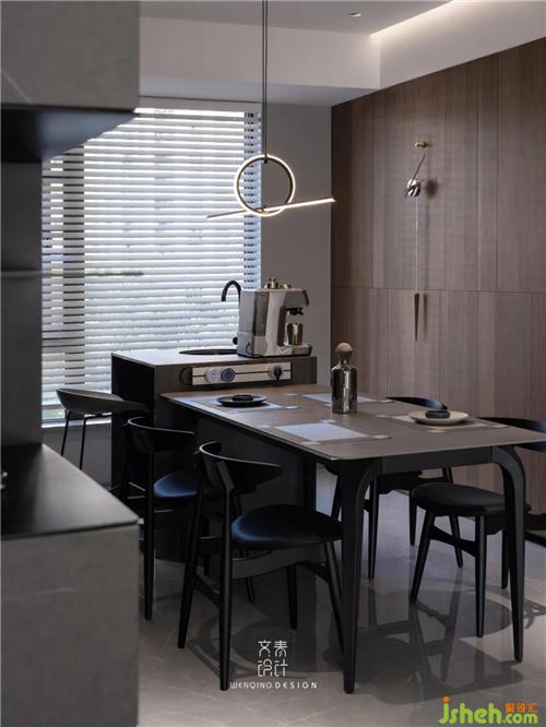 入戶鞋柜作為空間視覺轉折點,讓空間之間的過渡更柔和??紤]到餐廳的采光,運用百葉簾對光線的折射,營造光學美感。