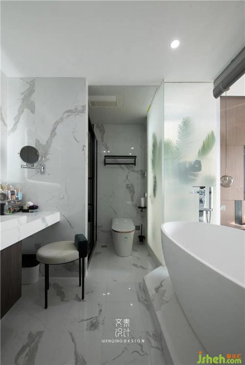 主臥延續(xù)木飾面背景設計,柔和的底色給人舒緩之感,設計風格鮮明的主衛(wèi)和綠植景觀,與柔和的底色形成鮮明的視覺反差,也成了臥室中的點睛之筆杭州裝修設公司。