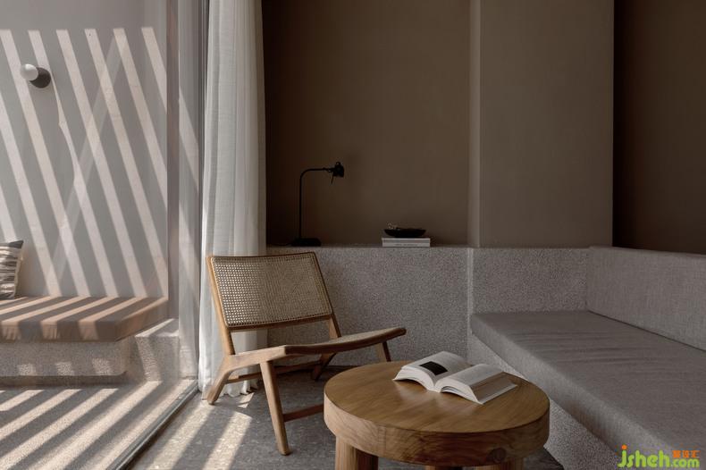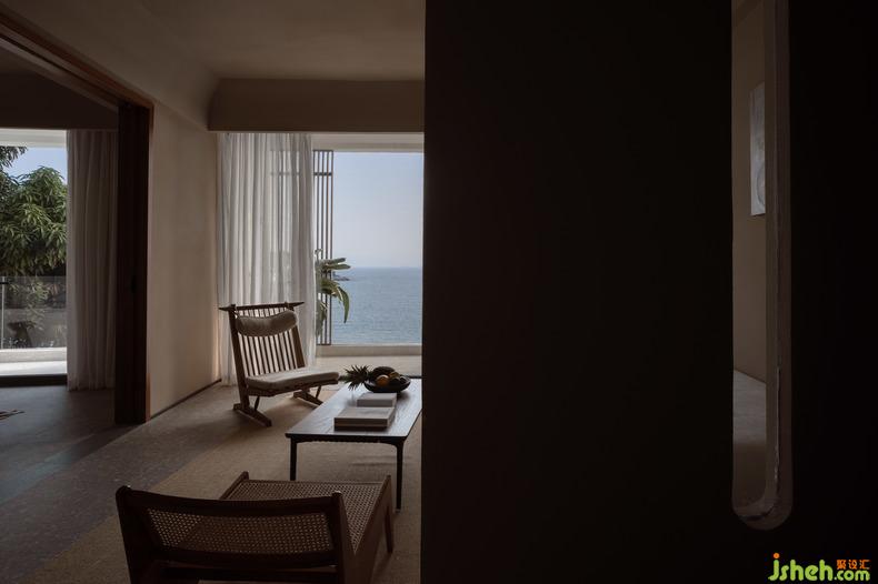 視角隨著光影延伸至海平面,將粼粼波光納入整個(gè)房間。房間的拙樸在自然的點(diǎn)映之下,也透著些柔軟的嬌憨。向外看去,目之所及的波浪溫柔起伏,微風(fēng)帶著海鹽味輕撫過(guò)臉龐,仿佛被大海擁抱;繞屋一圈,熱帶綠植,藤編家具,紡織抱枕,島嶼原石,與原木家具一起,裝飾出屋內(nèi)的質(zhì)感與格調(diào)。內(nèi)外皆是景,卻又在自成一體的同時(shí),融為一體。