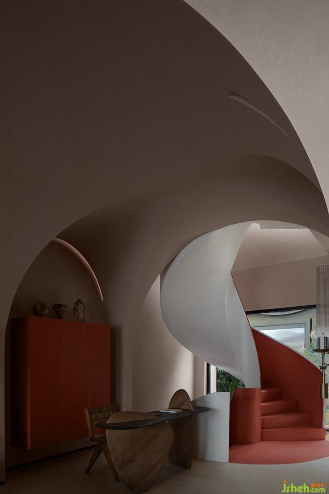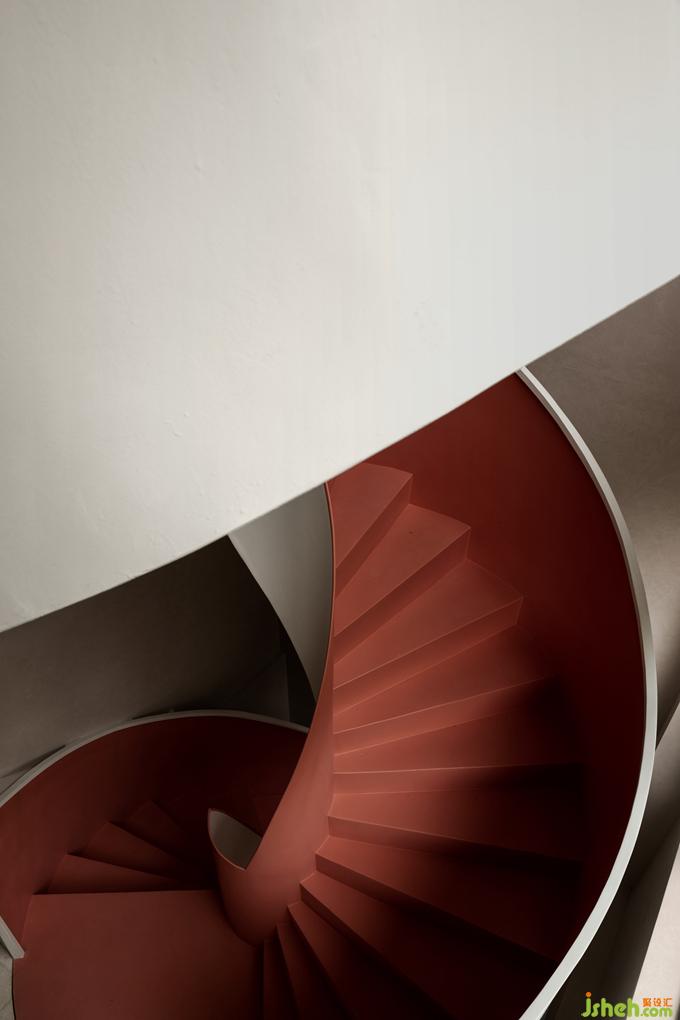 不同于外在的白色主色調(diào),樓梯內(nèi)裹的一抹朱色,為空間注入一分清新的亮度,帶來了年輕感與活力。卻又因添加的那一點(diǎn)樺色的沉淀,而多了一分克制的內(nèi)斂,將整個顏色的亮度下壓,達(dá)成了空間色系的平衡。酒店設(shè)計(jì)