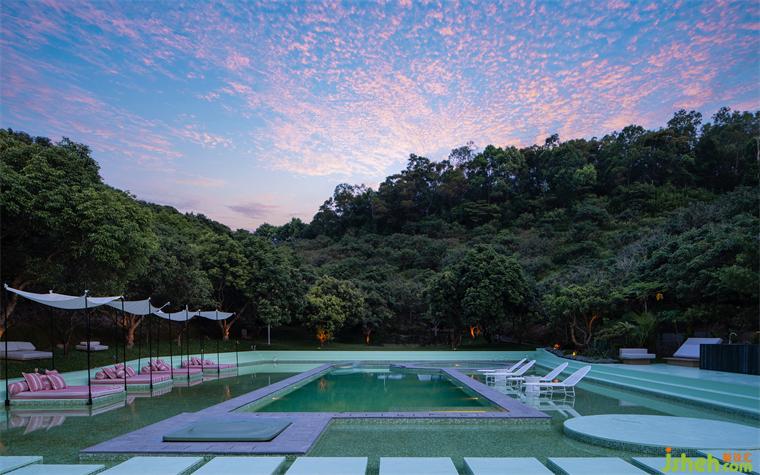 山間逸境的寬廣,深圳民宿設(shè)計(jì)給了設(shè)計(jì)師更多一點(diǎn)的任性。獨(dú)占一片空地,從滿山遍野的綠意,跳入另一片綠。方圓的拼接,打破泳池的固定形態(tài),將設(shè)計(jì)的趣味性外化。