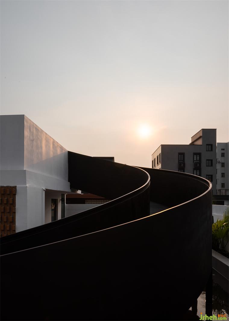 朝向陽光的奔赴是貫穿人類歷史的主題,不僅表現(xiàn)在于室內(nèi)的向外,酒店設(shè)計(jì)也同時(shí)存在于室外的向上。朝著陽光蜿蜒而上的黑色金屬梯,是陽光投射下流動(dòng)的影子。它承接一種直接的溫暖,也體悟一種恒久的寓意。