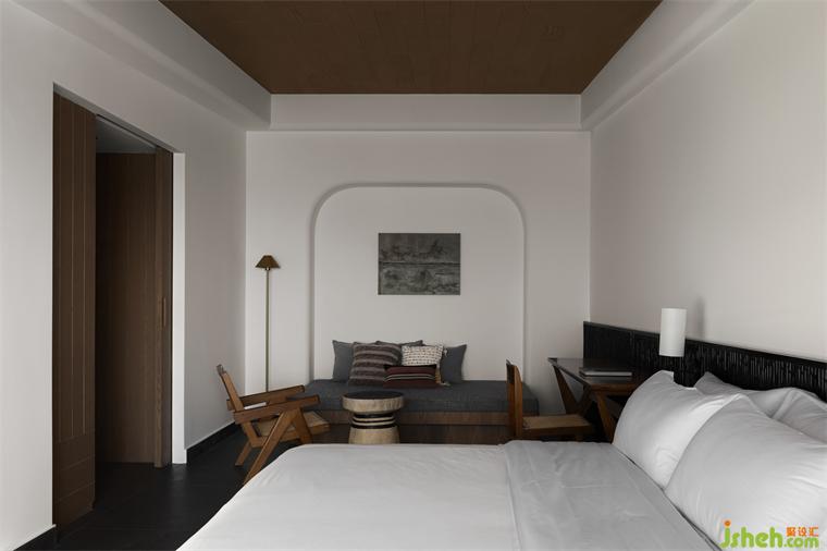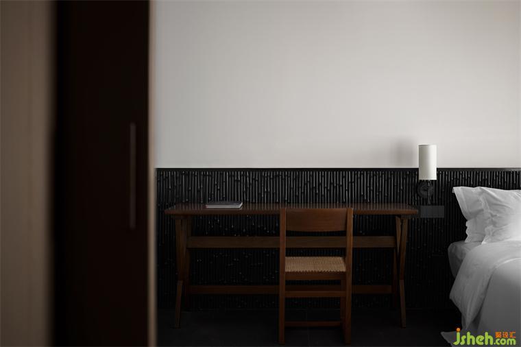 室內(nèi)空間的色調(diào)在黑白明暗的轉(zhuǎn)換間,引發(fā)了人的不同心緒。乳膠漆取代以往常用的微水泥,將空間明度提升,增添一抹現(xiàn)代感。黑色木籬笆挺立床頭,海景度假美宿設(shè)計(jì)在空間中舒展,帶來一絲拙樸的中式韻味。休憩此處,于午夜誤入夢(mèng)境,迷離間投射深埋內(nèi)心的真實(shí)三部曲。