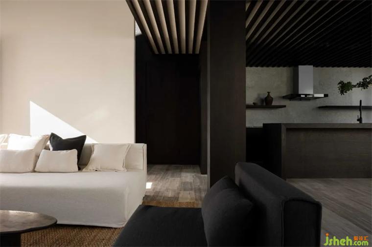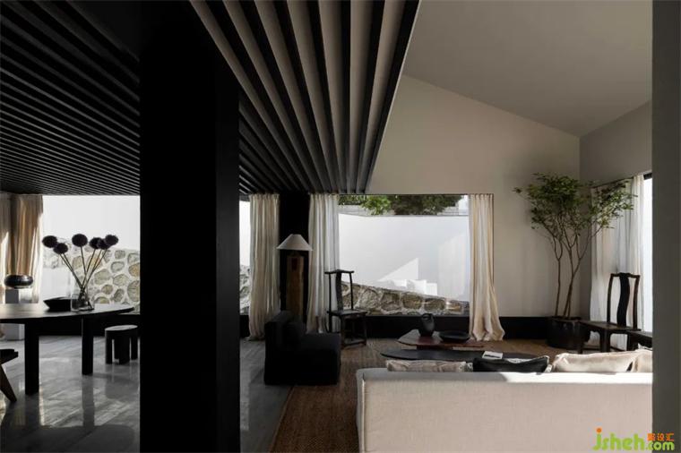 軟風(fēng)煙雨,青瓦飛檐;建筑和室內(nèi)空間皆以黑白為主色,對比鮮明,卻又能和諧相融。猶如一幅飄逸出塵的中國水墨,輕描淡寫幾筆,苫也不若林民宿設(shè)計(jì)卻能勾勒出大地山川、世間萬象,越簡單、越有韻味。猶如墨色的各類黑色材質(zhì),于空間的白色中擴(kuò)散開來,渲染出一幅令人更加安定、沉靜的氛圍。