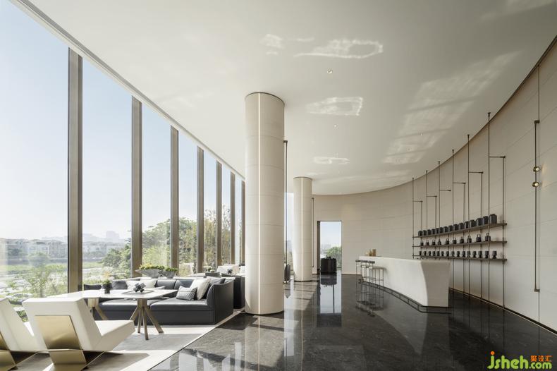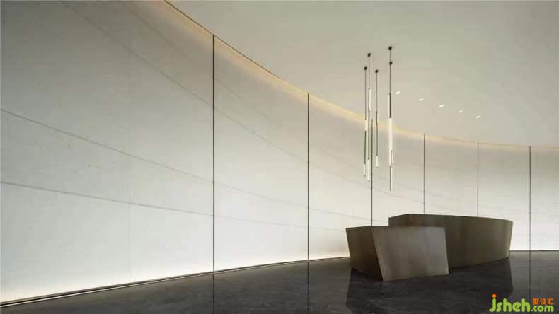 在空間布局與動線設(shè)計的考量上設(shè)計師貫徹了“流動空間”的設(shè)計理念,展示中心設(shè)計水吧與洽談區(qū)空間相互滲透,蜿蜒曲折的天花燈帶,林立安靜的軟裝陳設(shè)與美景交相呼應(yīng),簡單的色彩處理在光線對照中安靜而充滿變化,為社交宴席提供了良好的氛圍。