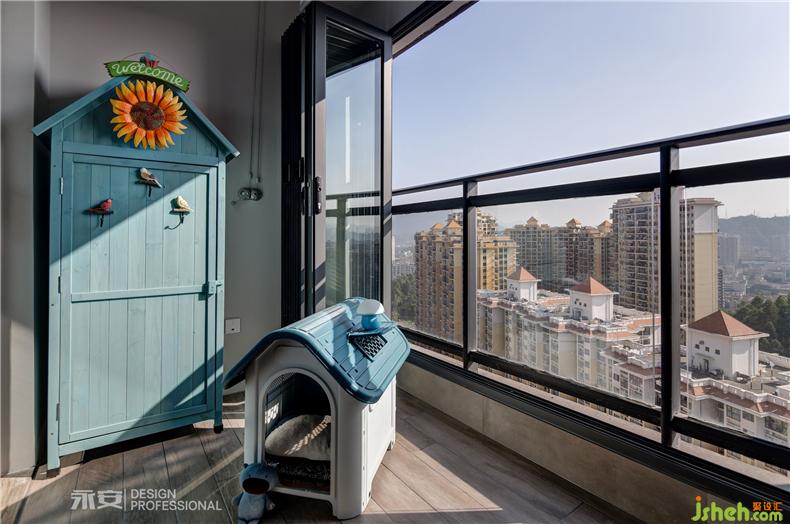 陽(yáng)臺(tái)的視線開(kāi)闊明朗,落地推拉門(mén)的設(shè)計(jì)讓陽(yáng)光、空氣、微風(fēng)等自然元素能夠通暢地傳遞到室內(nèi)。陽(yáng)臺(tái)左側(cè)是泰迪可愛(ài)的小屋子跟寵物柜,屋頂和柜面涂料都采用了輕松愉悅的蔚藍(lán)色,隱約間與客廳內(nèi)的幾抹淺藍(lán)以及窗外的藍(lán)天白云形成跳躍式的關(guān)聯(lián)