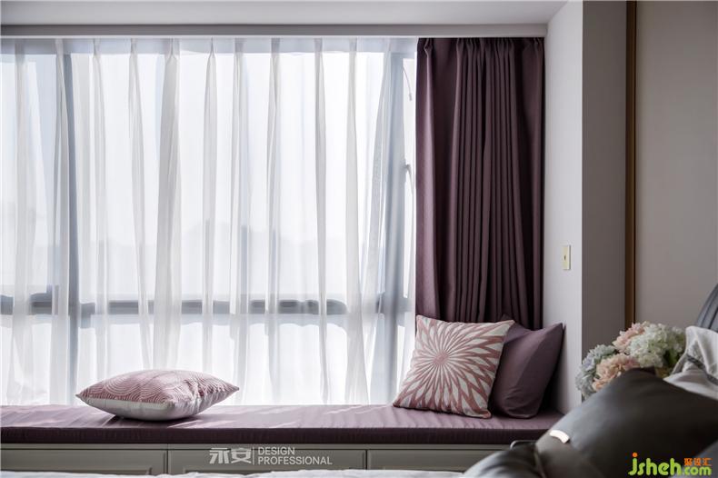 一扇可以?xún)扇嗣鎸?duì)面倚靠的大飄窗,以飽和度較低的紫荊紅為主題色,神秘中透露著浪漫。飄窗在紗簾的阻隔下為空間提供了適度的光線,空間內(nèi)的材質(zhì)在與光線的映照下相得益彰,以靜為動(dòng),呈現(xiàn)出一種流動(dòng)的韻律美感