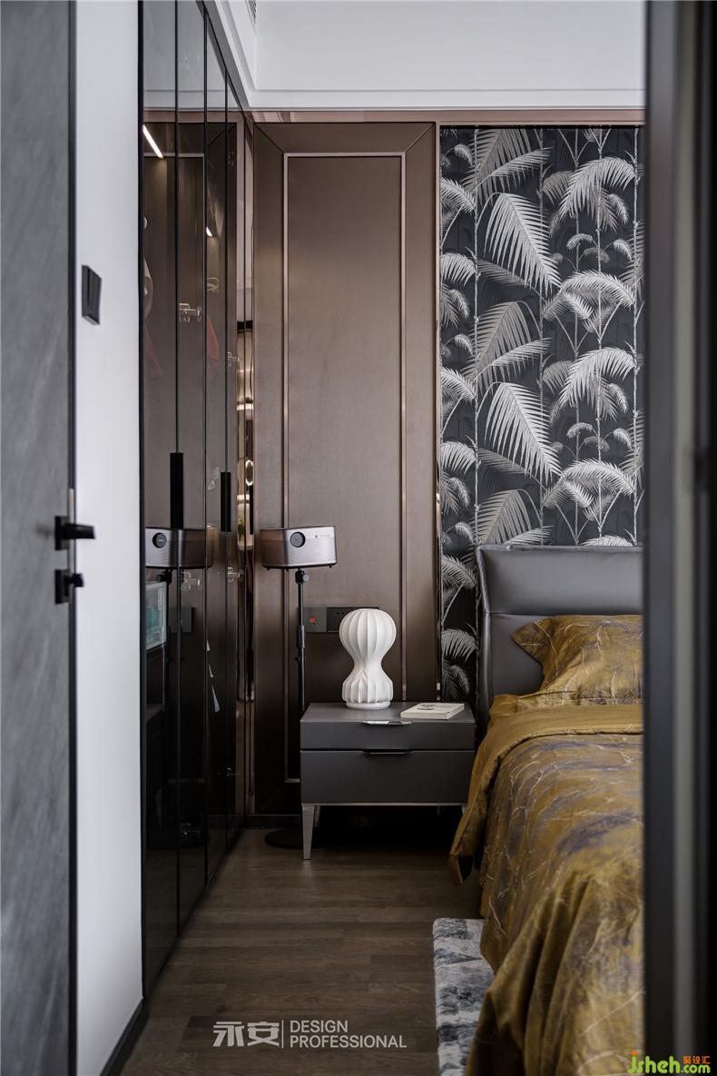 床頭是自然生趣的鳳尾竹巨幅壁畫(huà),搭配兩邊咖啡色的飾面板,加上質(zhì)感十足的黃銅框線進(jìn)行裝點(diǎn),呈現(xiàn)出一種古樸而又精致的美感。在此之下,是暗金色的被單與枕套,奢華而又舒適,善于享受生活的人自然不能在枕頭與被套上委屈自己。吊頂燈的外形猶如一團(tuán)漂浮著的羽毛,打開(kāi)燈時(shí),光線從羽毛間的縫隙中射出,整個(gè)主臥在這一縷縷光線的照耀下熠熠生輝