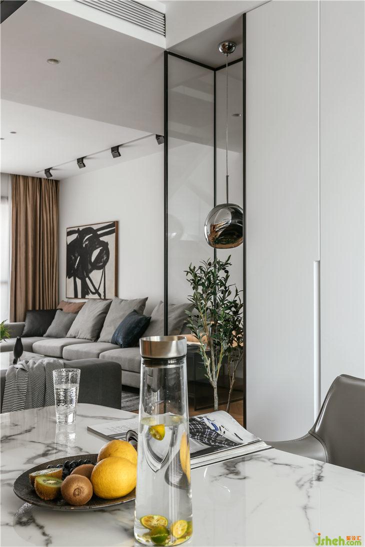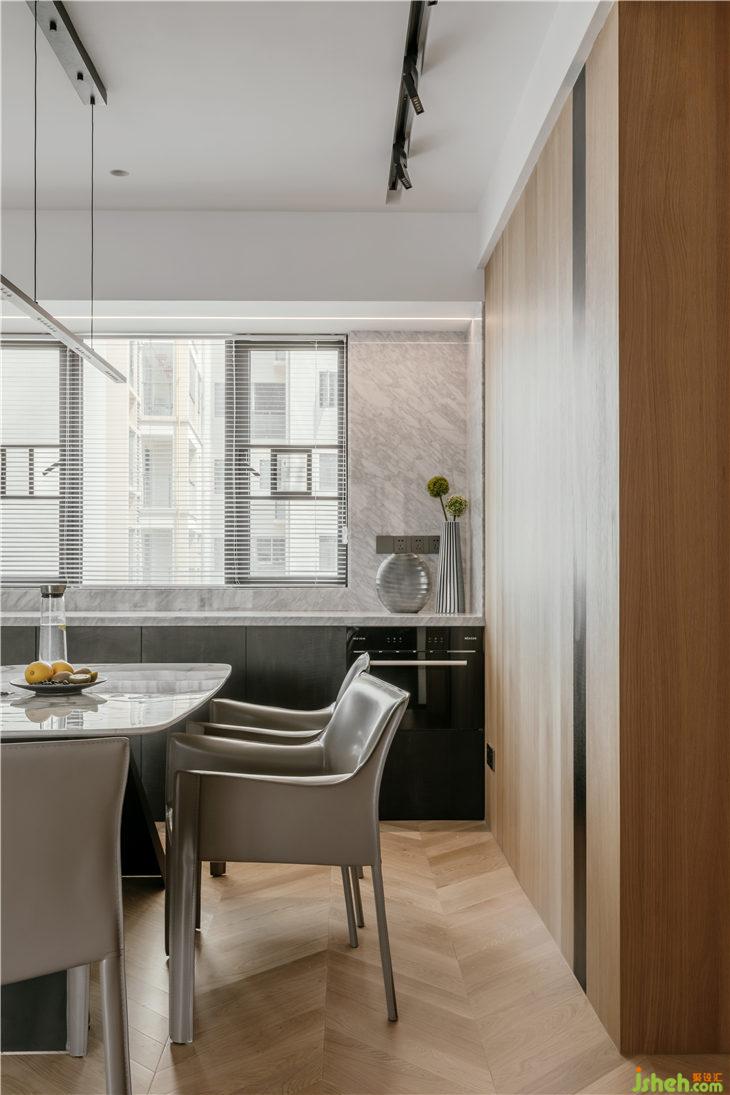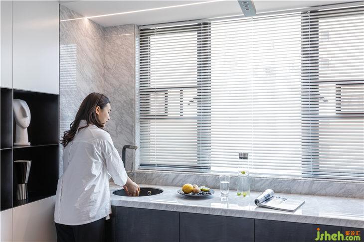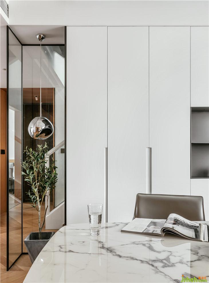 餐廳旁水吧臺的設計,兼顧日常全家人飲水及冷餐操作吧臺的作用,清晨的陽光懶懶的灑進來,笑意盎然。