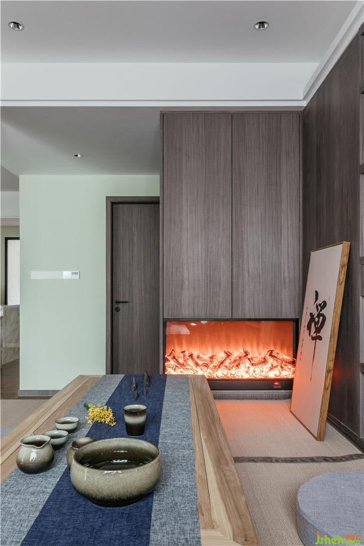 茶室左側(cè)高柜下設(shè)計(jì)內(nèi)嵌LED壁爐,熱烈的火焰在搖擺在燃燒,暖意盎然,營造溫馨氛圍感。