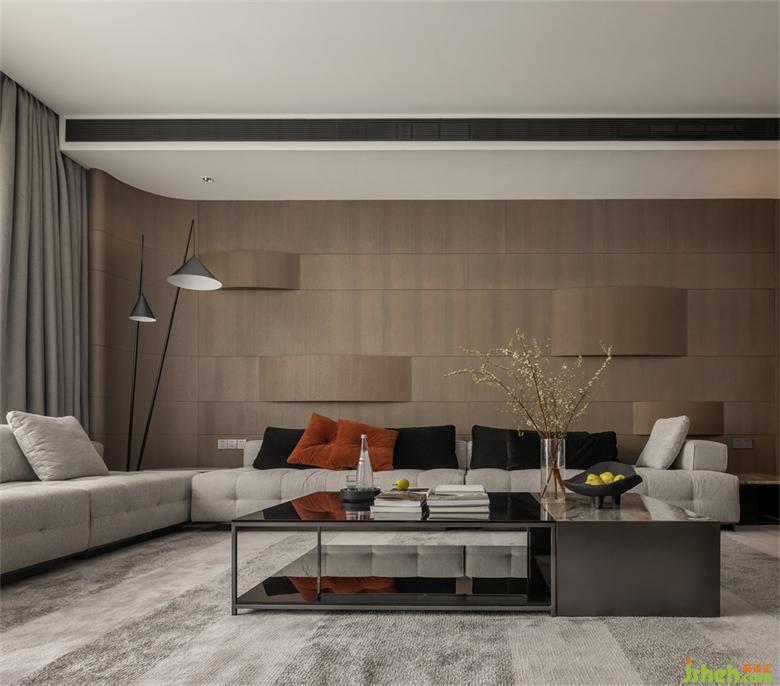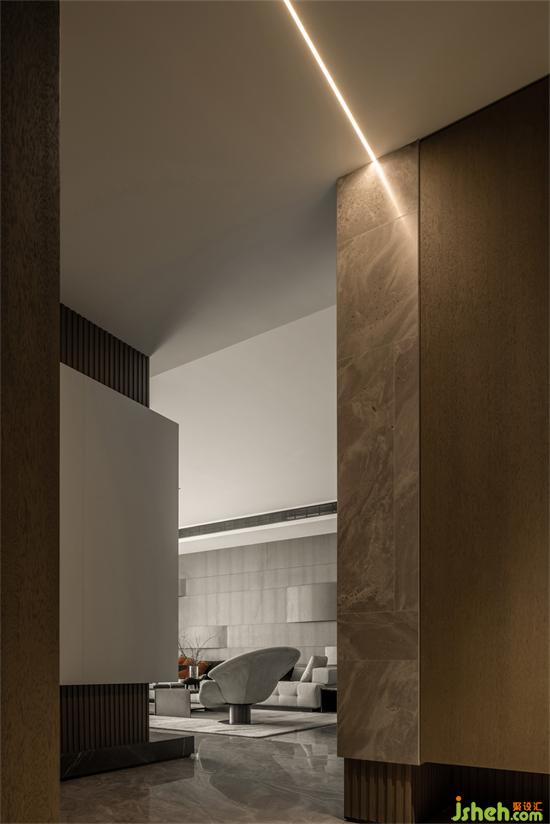 墻面材質(zhì)的鋪陳、延續(xù),通過大量的塊面交錯關系,從視覺和動線感受上,拉長空間的縱深感及開闊感。東江首府家裝設計對空間中的燈光,進行了線條化引導處理,強調(diào)結(jié)合空間光影層次。家裝設計頂部線性燈光帶來空間的延伸感,同時以其極細膩的光感分布。