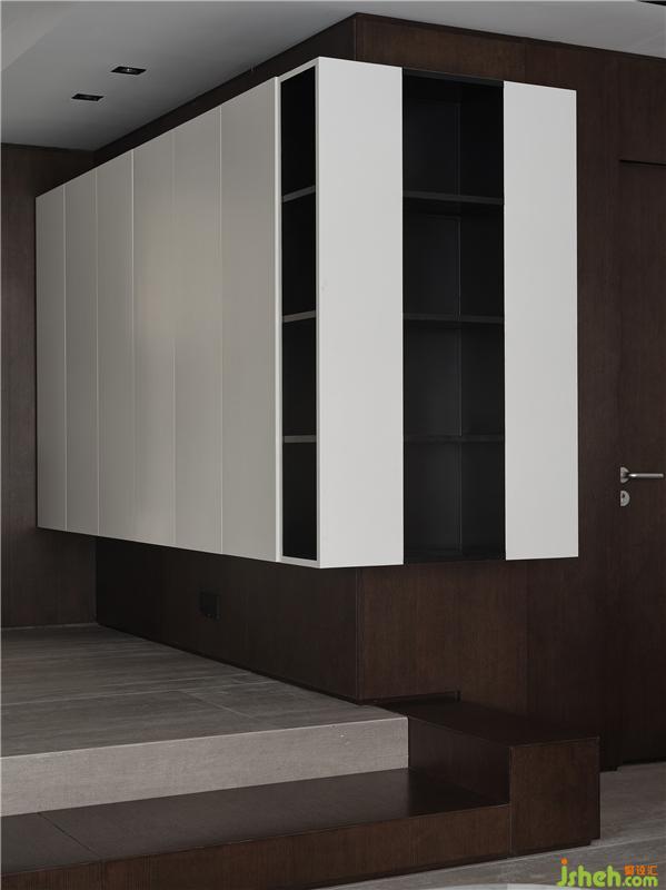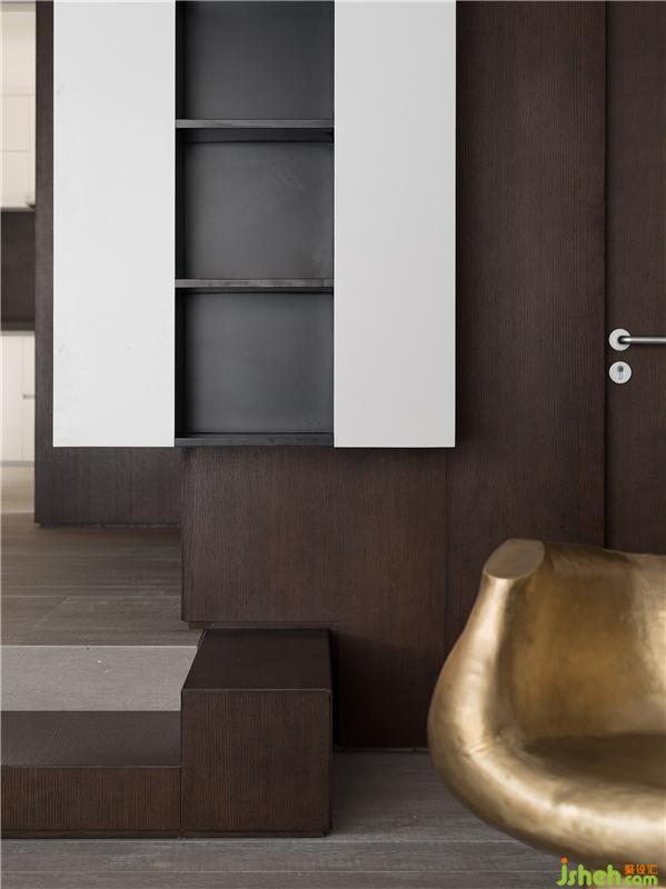 轉(zhuǎn)身回望,一道暗門藏于此處。以階為界,以色為界,設(shè)計師利用對比強(qiáng)烈的木色營造體驗效果的差異,觸動居住者探索未知空間的好奇心。細(xì)微處見功夫,設(shè)計的巧思為人們帶去便利的同時也給予無限的探索可能。