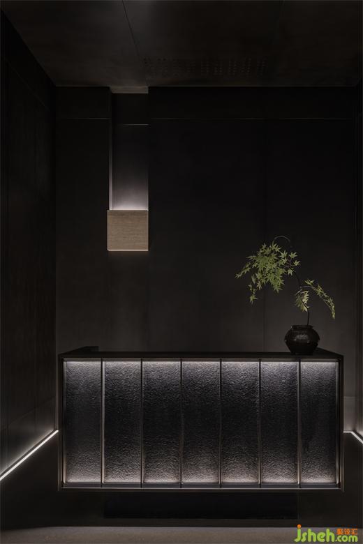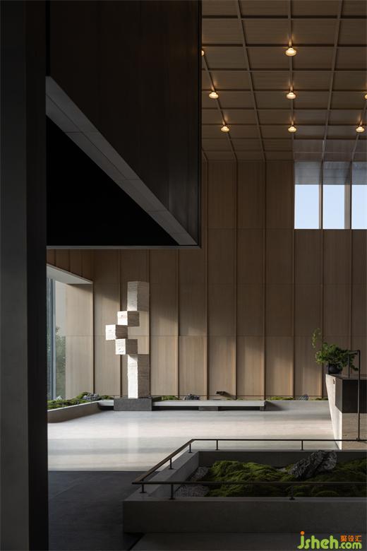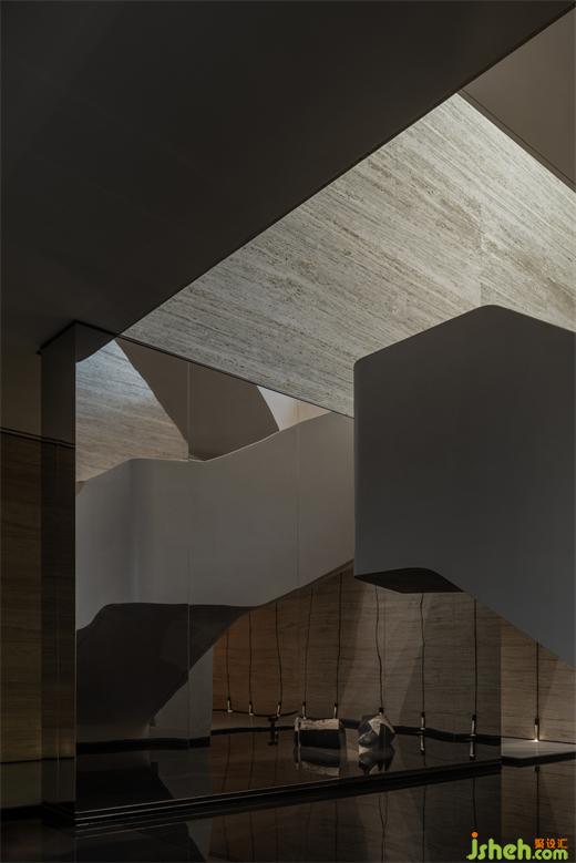 曲折迂回,幽閉與開敞之間戲劇性的轉(zhuǎn)換成為空間的主旋律。行至后場,豁然首見通透玉石,隱示空間轉(zhuǎn)入溫潤高雅之境??臻g的轉(zhuǎn)折變幻,營造出人、空間、環(huán)境之間的互動關(guān)系。幽暗之處,令人專注;而開敞之時,又使人心境豁然開朗,相互襯托,形成對比與和諧的統(tǒng)一。