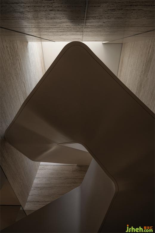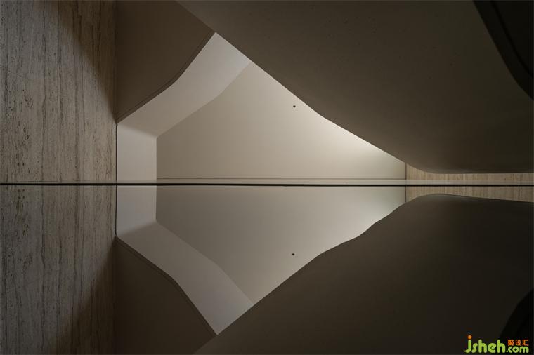 游觀于此,向下俯視,藝術(shù)樓梯遂成空間焦點。打破傳統(tǒng)空間的靜態(tài)感,視線流動,使空間在垂直方向上得到延展與層次感。而大量天然洞石,會所設(shè)計使室內(nèi)猶如天然洞穴,當(dāng)光影流動,呈現(xiàn)出自然的原始力量,室內(nèi)為山,室外為景。