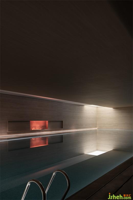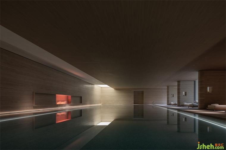 游泳區(qū)域的設(shè)計旨在營造一種獨特的序列感,使人在其中體驗到時間的流逝,同時與室外環(huán)境進(jìn)行有機的連接。采用了一系列秩序墻體的空間序列,通過曲線設(shè)計與錯落的開合關(guān)系,引導(dǎo)人們在游泳過程中感受到節(jié)奏感與空間的變化。