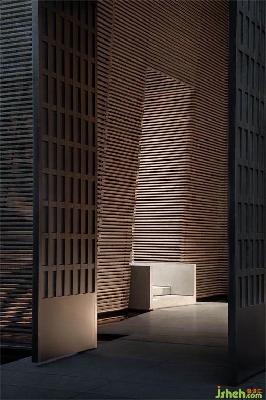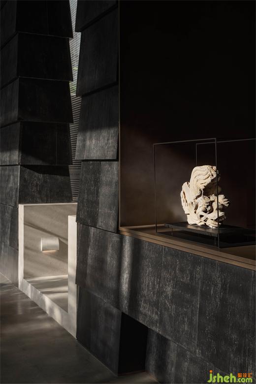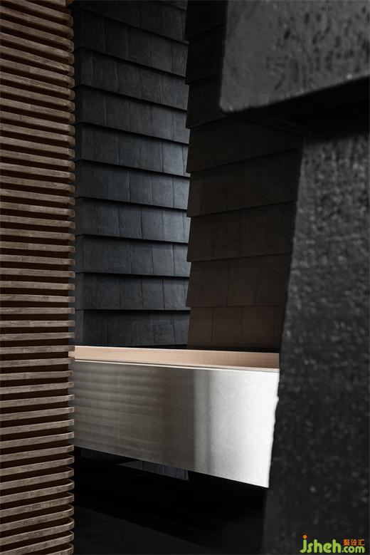 墨色的陶板如自然的瓦片,隱含著山間廬舍的質樸柔和。案牘之上的瓶花清供,折射出插花之人的意趣和性情?!八故锹遥┪岬萝啊?,清雅之物的擺放使東方的審美意境在當下的空間中延續(xù),光線透過VIP室底部的開合縫隙,與庭院之中的蔥翠融為一體,如畫般通透美好。