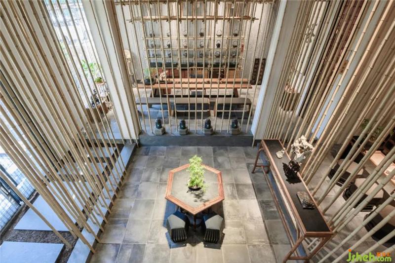 屋舍布列,遵從 “三進門廳,禮序歸家”的中式建筑古法舊制,融合現(xiàn)代審美視角,以軸線對稱的差異化手法,前后分設(shè)門廳、正廳、后廳,左右分設(shè)待客、藏室之區(qū)??臻g雕琢上,通過射燈、竹簾、案幾、擺件,以及薄墨地磚的使用,既形成高低錯落的層次之感,又衍生出“竹拔于土,節(jié)節(jié)攀升”的挺秀美境。