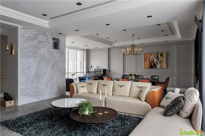 屋主長年經(jīng)商,希望新家離塵不離城且能保有安全隱私性,訴求公共空間的尺度和質(zhì)感能滿足他經(jīng)??畲e客的需求;加上三代同堂的家庭組成,生活舒適性也是本次設(shè)計的重要考量。設(shè)計團隊除了運用開闊而通透的形式重塑空間,增加一樓公領(lǐng)域腹地、放大視覺感之外,亦將梁柱結(jié)構(gòu)或轉(zhuǎn)換為場域間的隱形界限,或延伸設(shè)計出實用柜體;同時仔細忖度材質(zhì)與顏色的配置,且以優(yōu)雅線條建構(gòu)主要立面,搭配玄關(guān)處特別訂制的家徽圖騰地坪,以及最大限度地引進室外景觀,在在皆呼應(yīng)「奢華而寧靜的家」之設(shè)計核心。